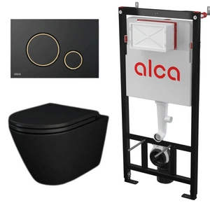 RAK Ceramics FEELING Resort Miska WC podwiesz. Rimless 52x36 cm czarny mat (504) ze stelażem i przyciskiem THIN Czarny mat/ Złoty połysk Alcadrain