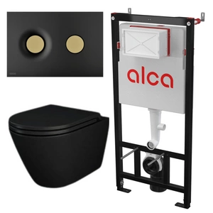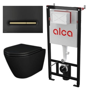 RAK Ceramics FEELING Resort Miska WC podwiesz. Rimless 52x36 cm czarny mat (504) ze stelażem i przyciskiem Linka Czarny Mat/ Złoty mat Alcadrain