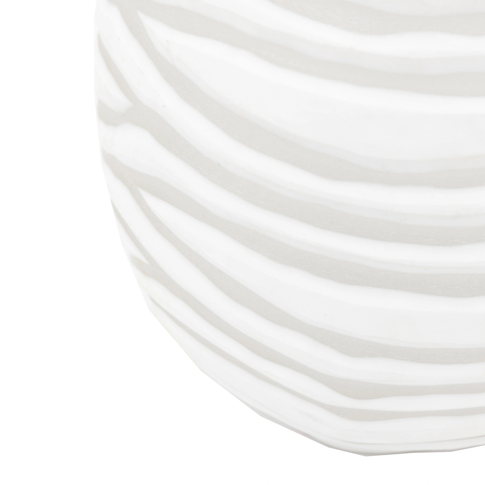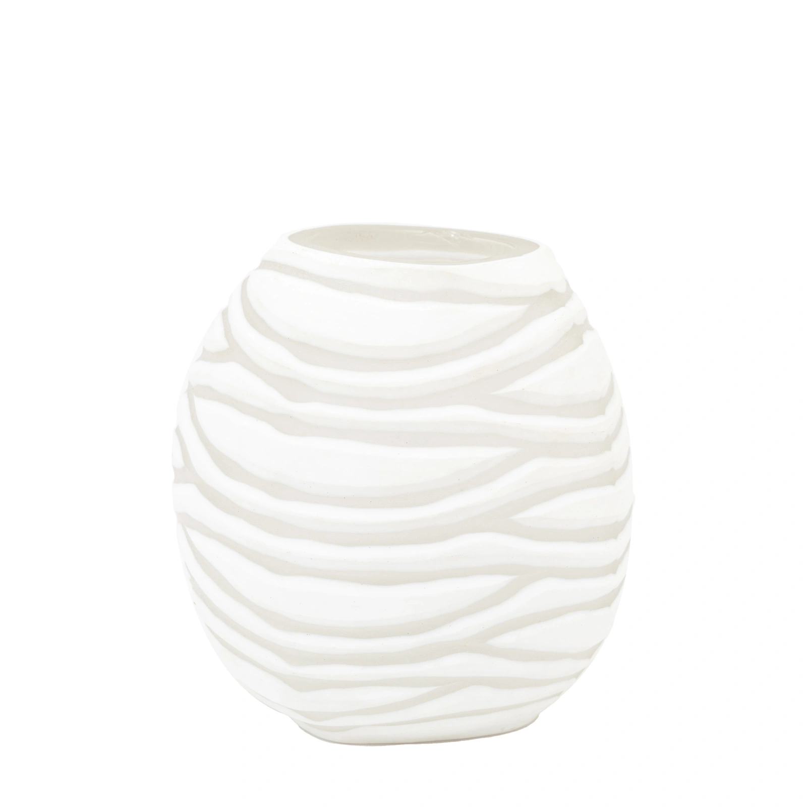 Hand blown with stunning detail this heavy white glass vase comes to life when backlit against a window or other light source. The hand carved freeform stripes and organic shape have a natural feel, adding a beautifully elegant touch to a room.