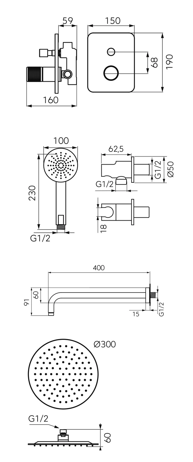 Bateria natryskowa podtynkowa • 2-funkcyjna • zestaw elementów wewnętrznych i natynkowych • montaż podtynkowy • przełącznik 2-funkcyjny • regulator ceramiczny • przyłącze G1⁄2 • wyprowadzenie natrysku G1⁄2 Deszczownia • ramię podtynkowe natryskowe 400 mm • głowica deszczowni stalowa typu SLIM 300 mm Natrysk • przyłącze podtynkowe z uchwytem na rączkę natryskową • rączka natryskowa 3 funkcyjna • wąż PVC 150 cm