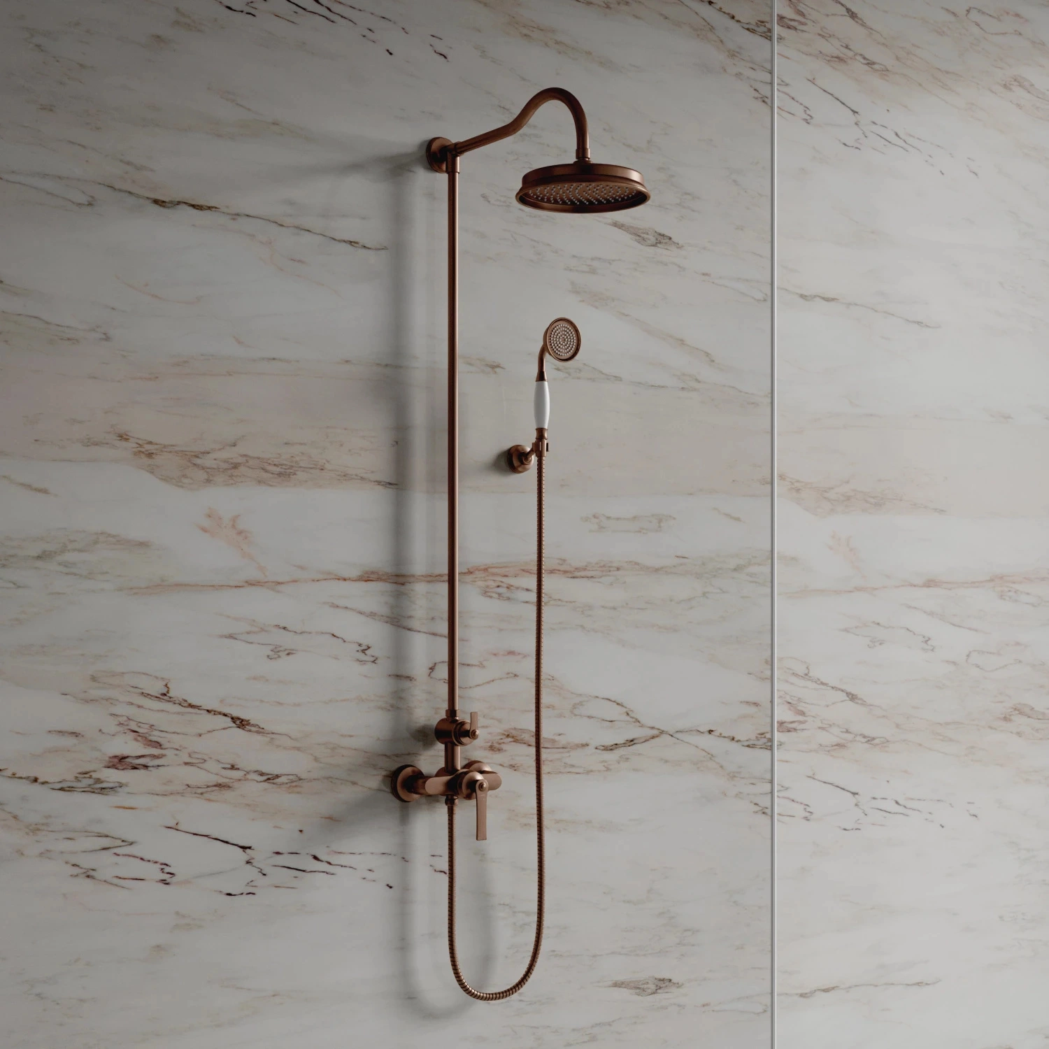 Miedź antyczna jest wyrazistym wykończeniem o rudo-brązowym odcieniu i szczotkowanej fakturze w stylu vintage.