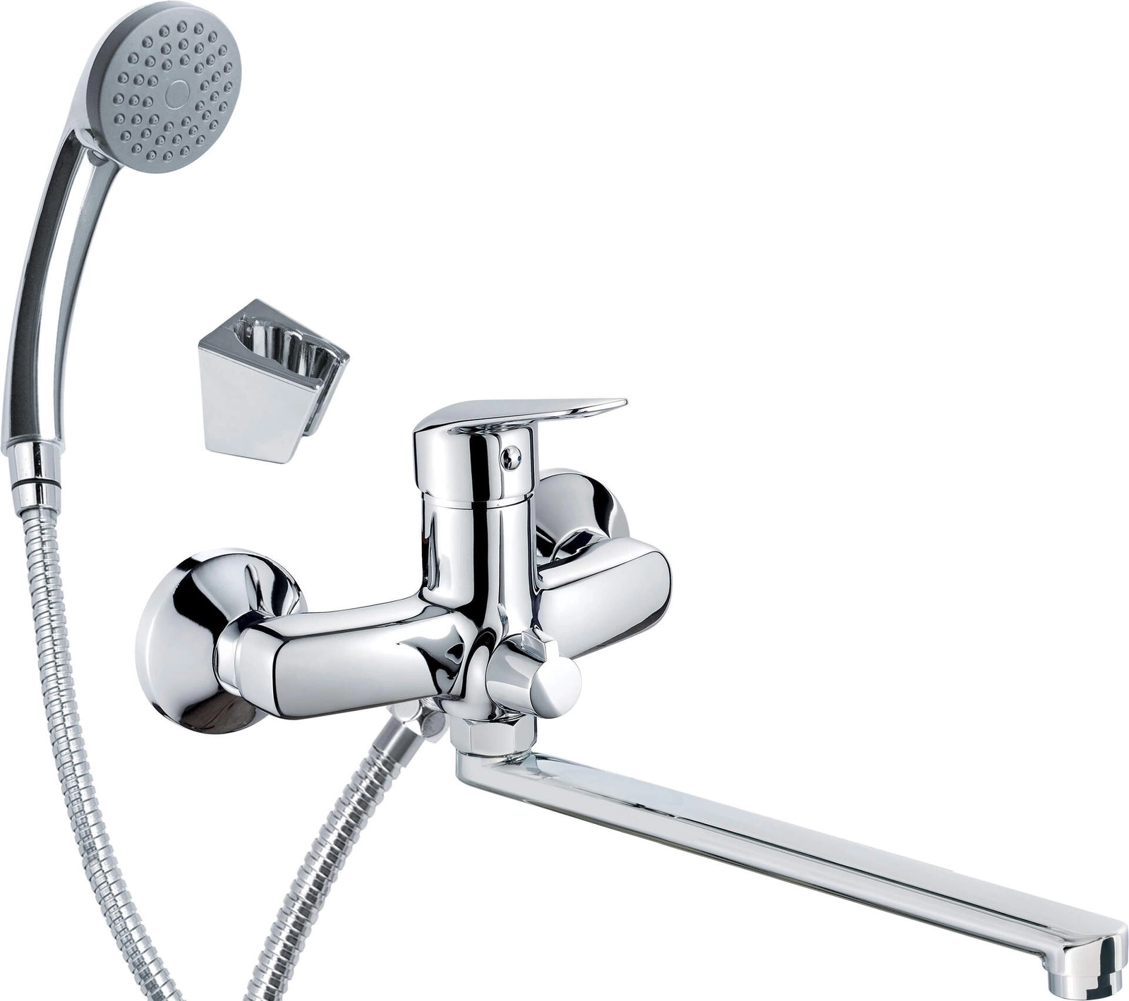 Bateria umywalkowa ścienna z wydłużoną wylewką - podłączenie na wąż i zestaw natryskowy