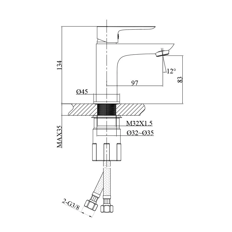 Kolor:Chrom:5:0, Materiał :Mosiądz:6:0, Zasięg wylewki (mm):97:90:1, Wysokość wypływu wody (mm):83:91:1, Całkowita wysokość baterii (mm):134:92:1