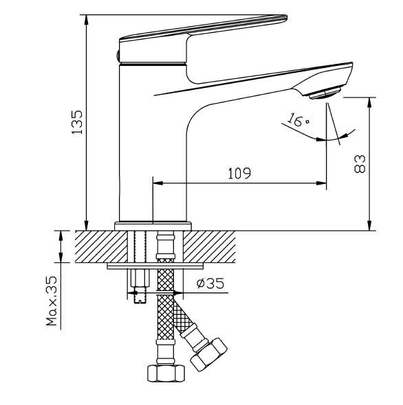 - Wymiary: wysokość całkowita 135 mm, zasięg wylewki 109 mm, wysokość wylewki 83 mm,