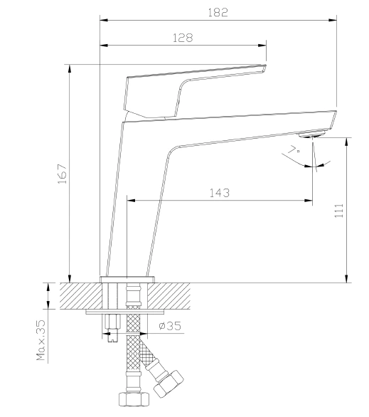 - Wysokość całkowita: 167 mm; zasięg wylewki: 143 mm; długość całkowita korpusu: 182 mm,