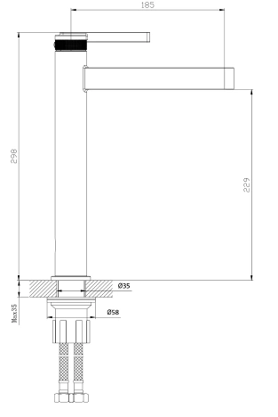 • Wysokość całkowita: 298 mm; zasięg wylewki: 185 mm; zalecany otwór montażowy: 35 mm; przyłącza 3/8"; długość wężyków: 400 mm.