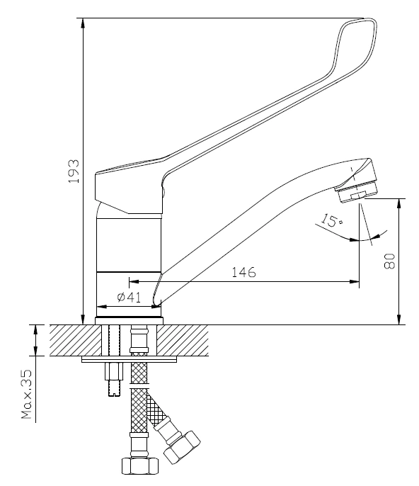 - Zasięg wylewki: 146 mm; wysokość całkowita: 193 mm; wysokość wylewki: 80 mm; kąt regulacji strumienia: 15°; max grubość blatu: 35 mm; średnica otworu montażowego: 41 mm,