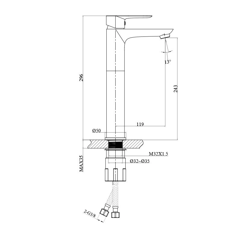 Kolor:Gunmetal:5:0, Materiał :Mosiądz:6:0, Zasięg wylewki (mm):119:90:1, Wysokość wypływu wody (mm):243:91:1, Całkowita wysokość baterii (mm):296:92:1