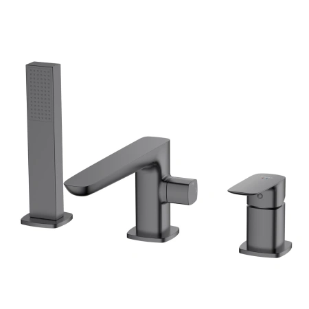 • Avapax QANIX Bateria wannowa 3‑otworowa, symbol produktu ABQA231421, w kolorze gun metal (mat). Jednouchwytowa, z ruchomą wylewką i mechanicznym przełącznikiem. Cicha praca, trwały mosiądz, słuchawka z długim wężem, montaż na rancie wanny.