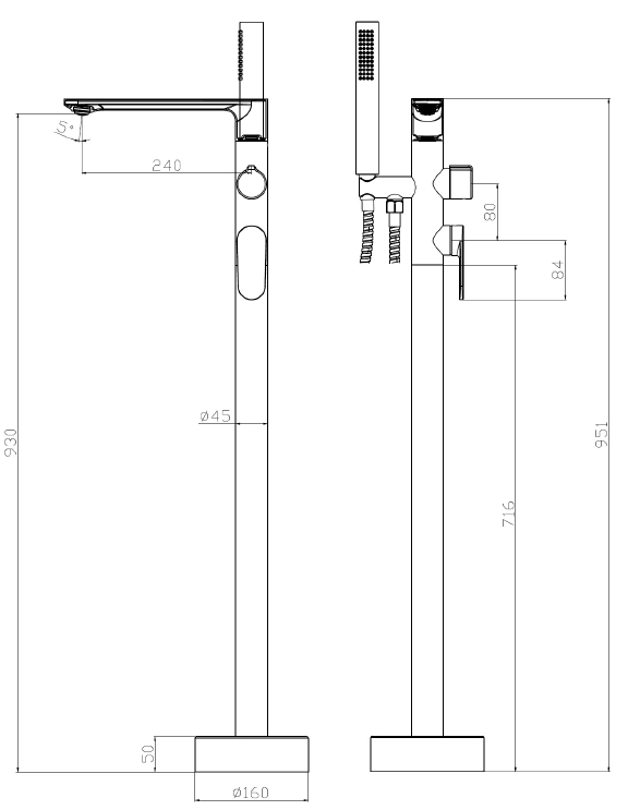 • Wymiary orientacyjne: wysokość całkowita ok. 951 mm, zasięg wylewki 240 mm, podstawa Ø160 mm, trzon kolumny Ø45 mm,
