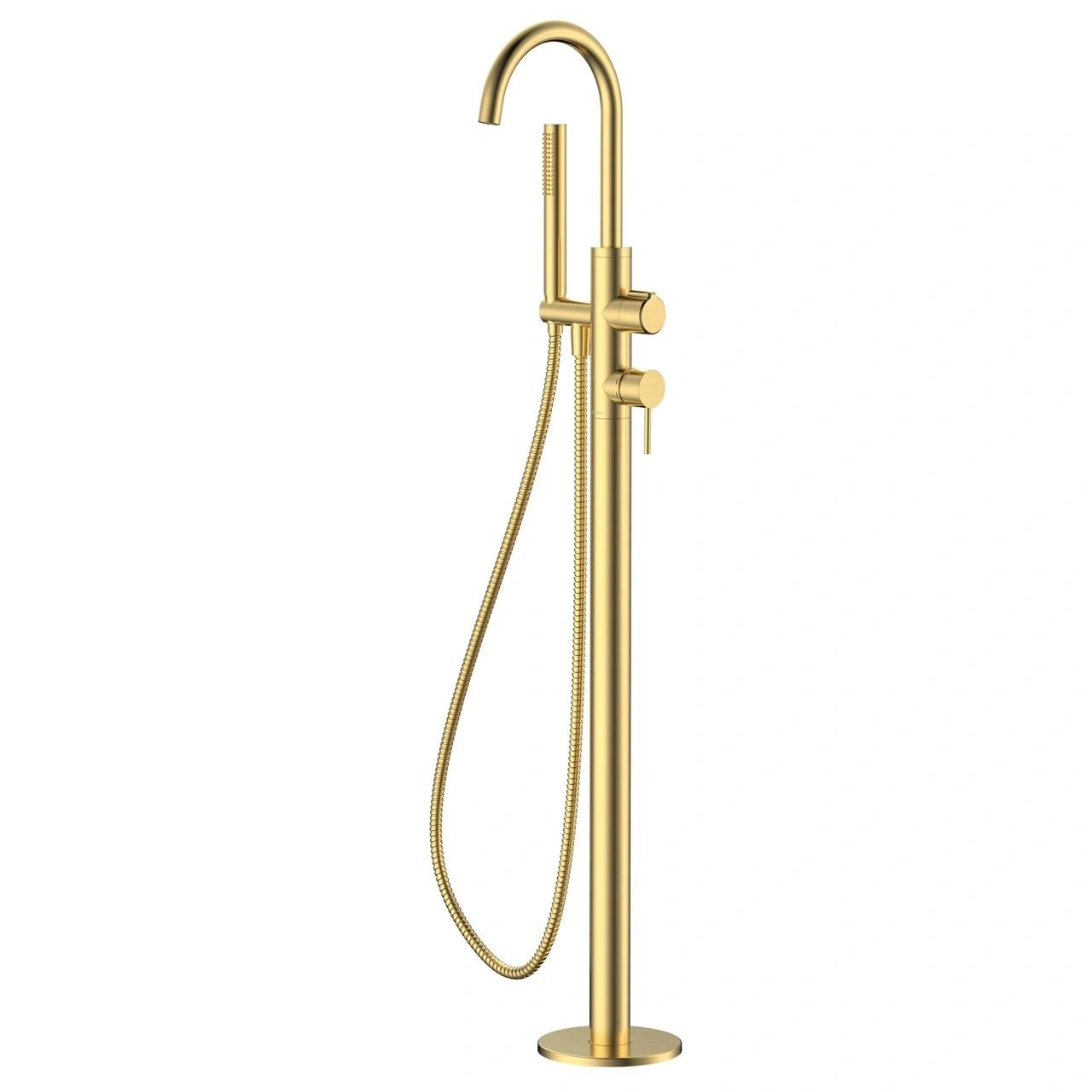 Bateria wannowa wolnostojąca z zestawem natryskowym (kod: ABUL221221) – kolekcja ULTIMATE marki AVAPAX. Smukła, cylindryczna i proporcjonalna forma w eleganckim wykończeniu złoty szczotkowany Brushed Gold buduje hotelowy charakter premium i nowoczesny minimalizm; solidny mosiądz i precyzyjne detale zapewniają trwałość, a ręczny natrysk dopełnia komfortu codziennego relaksu.