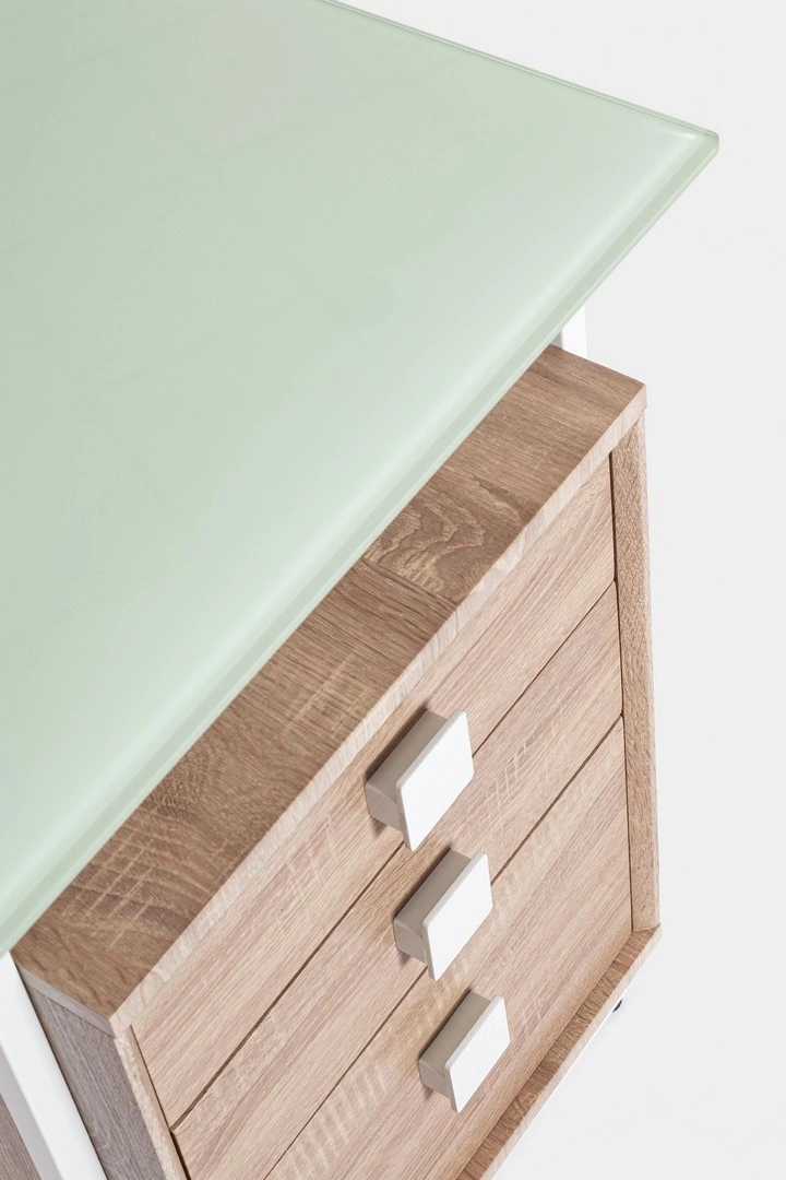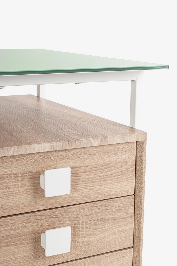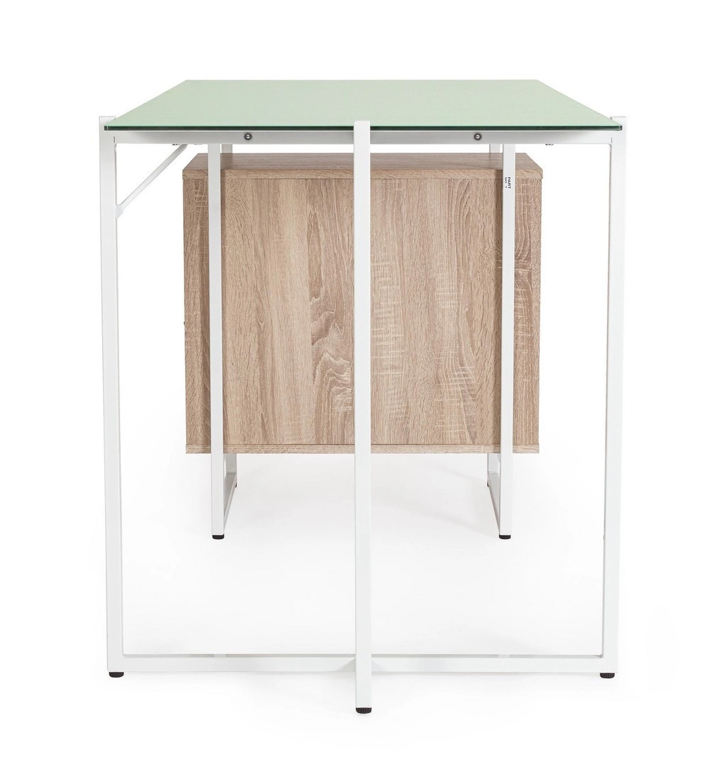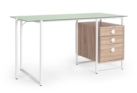 BIZZOTTO biurko THOMAS. Stylowy element wyposażenia o nowoczesnym designie. Rama biurka została wykonana z metalu, pomalowanego na kolor biały, co zapewnia trwałość oraz odporność na zarysowania i korozję. Blat z hartowanego szkła o grubości 8 mm wyróżnia się dużą odpornością na uszkodzenia i łatwością w utrzymaniu czystości. Praktyczne szuflady z MDF-u ułatwiają organizację przestrzeni roboczej i pomagają utrzymać porządek. Biurko idealnie sprawdzi się w nowoczesnych i minimalistycznych wnętrzach, zarówno w domowym biurze, jak i w eleganckim gabinecie. Wymiary: wys. 76 cm / szer. 142 cm / gł. 69 cm Waga brutto: 52,5 kg.