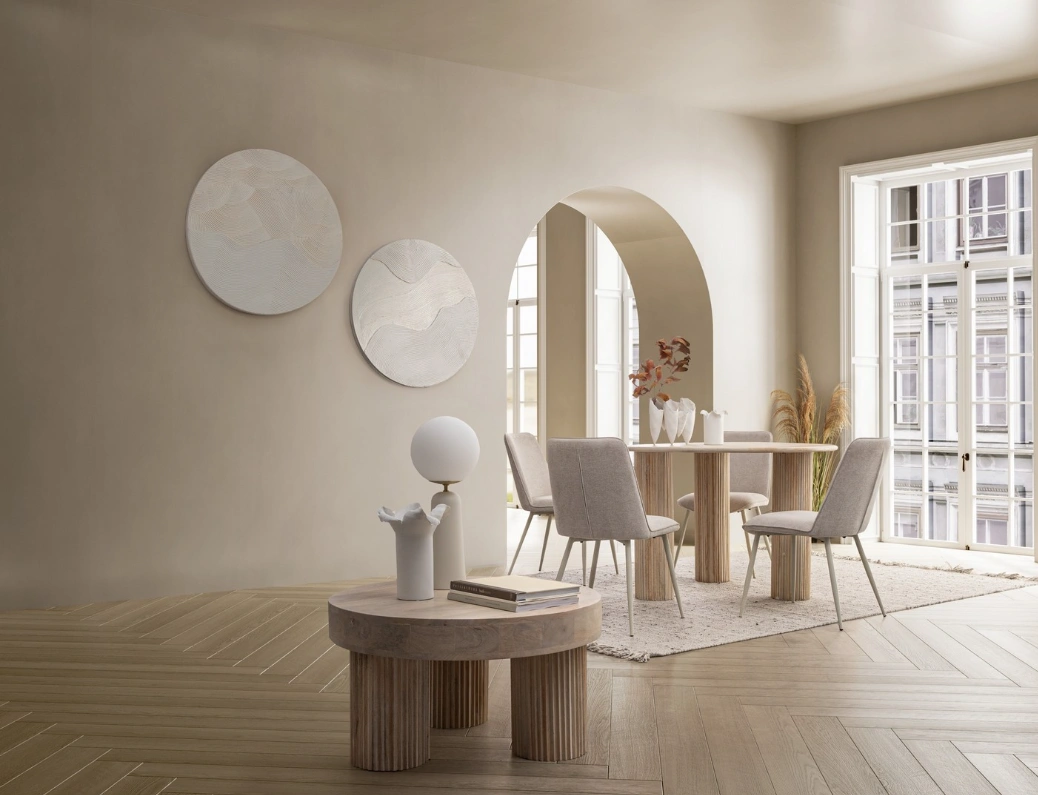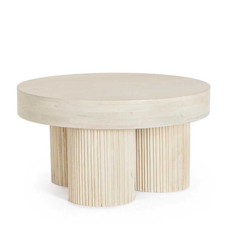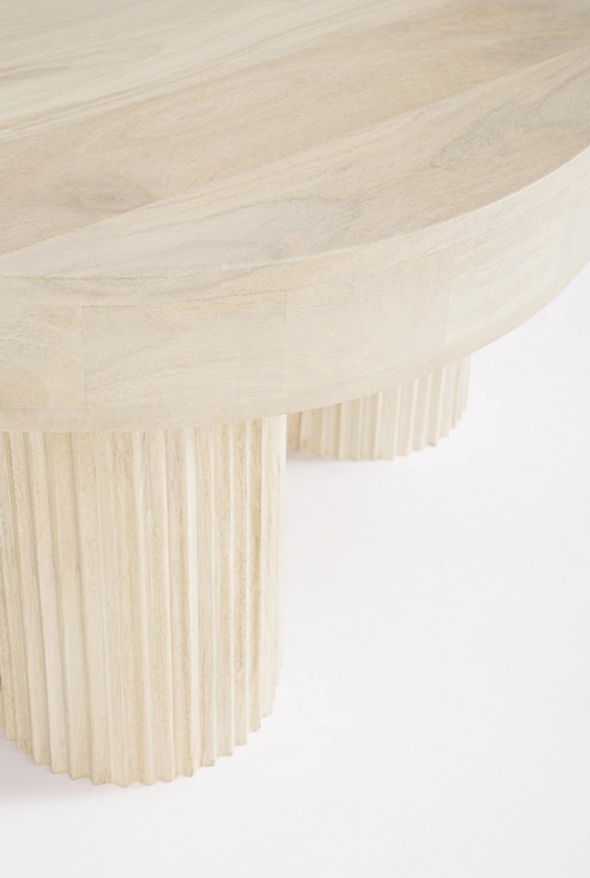 Stolik posiada masywny, okrągły blat osadzony na trzech szerokich, cylindrycznych nogach o żłobkowanej fakturze, co nadaje mu rzeźbiarski i nowoczesny charakter. Naturalny, ciepły odcień drewna wprowadza do wnętrza przytulność i harmonię, doskonale komponując się z różnorodnymi aranżacjami.