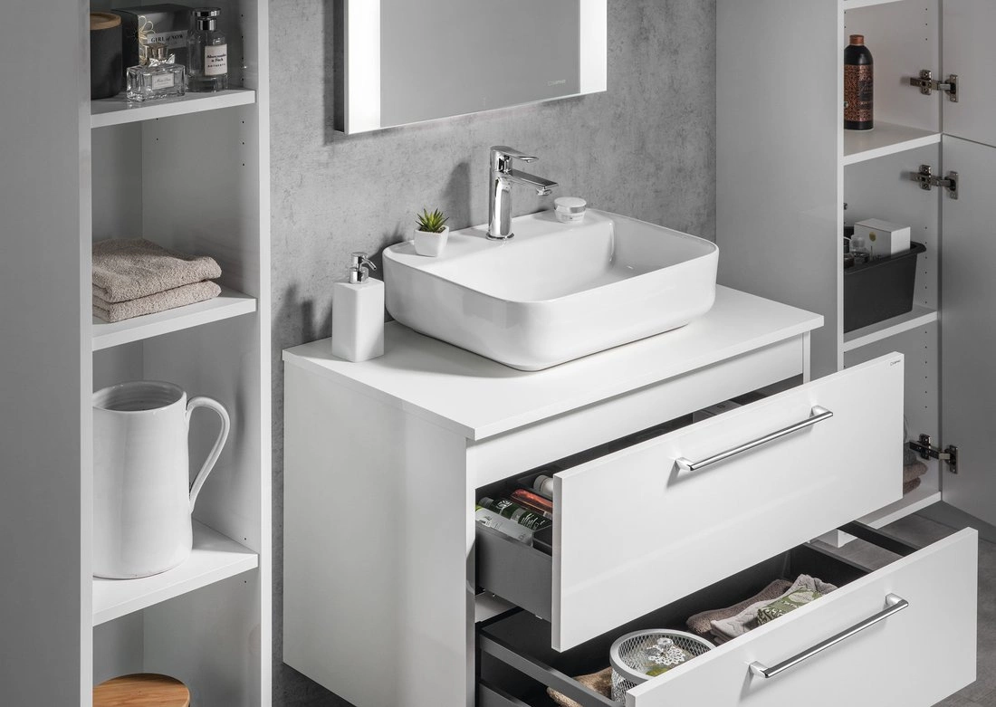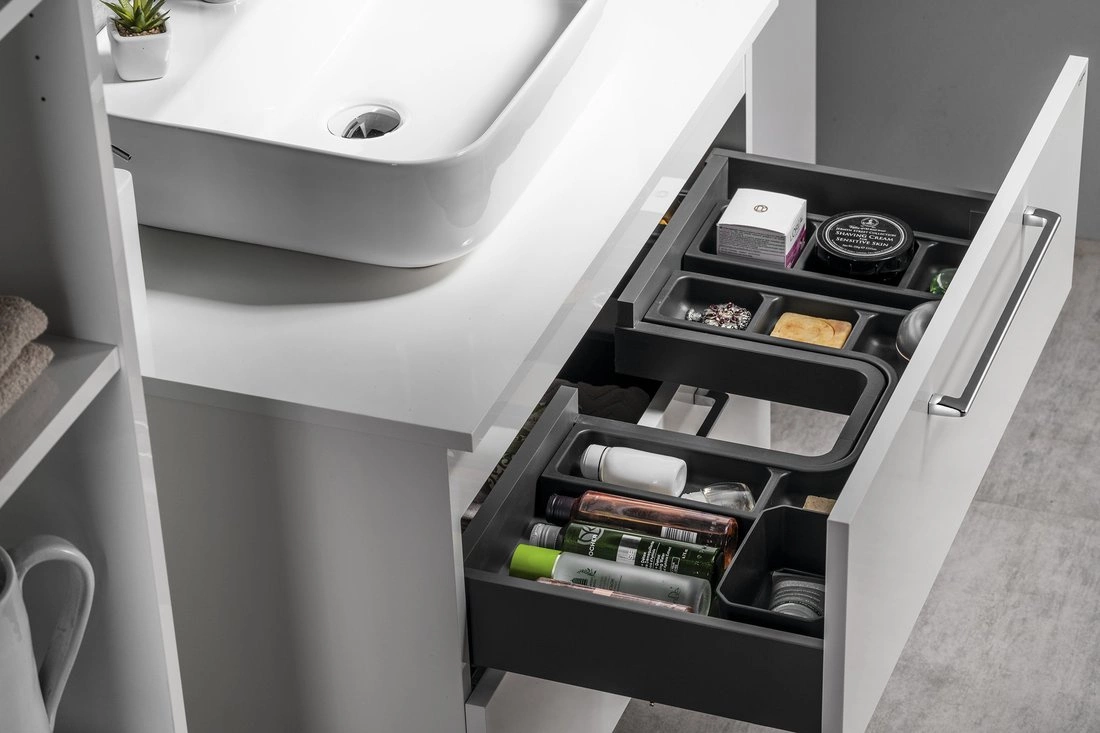 Dużym atutem jest możliwość zamówienia praktycznych organizerów LINDO oraz pojemników do przechowywania drobnych przedmiotów codziennego użytku w górnej i dolnej szufladzie. Szuflady wyposażone są w pojazdy z cichym domykiem, drzwiczki posiadają zawiasy zwalniające. Szafki umywalkowe CIRASA dobrze się komponują z uniwersalnymi słupkami o dodatkowymi szafkami z serii ESPACE