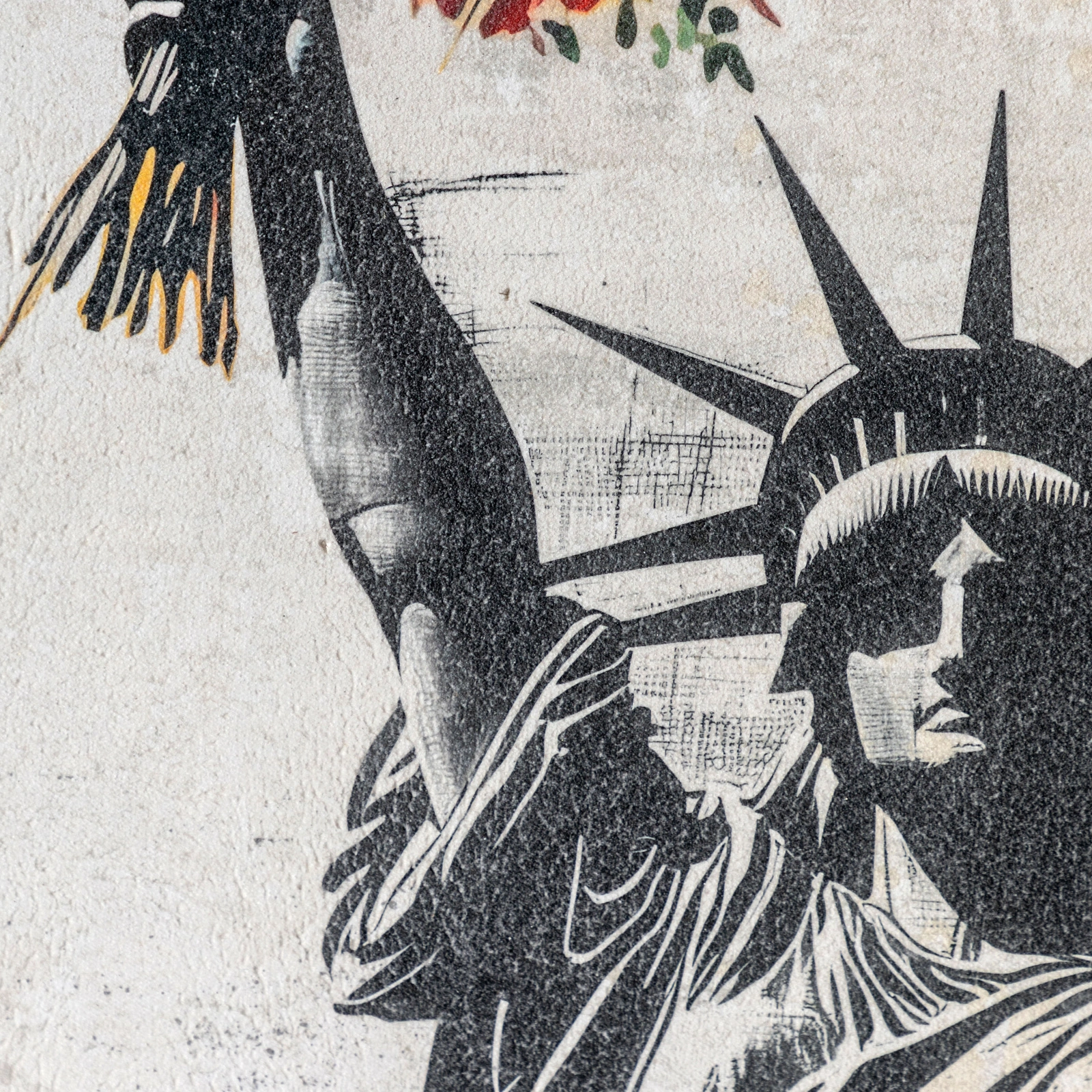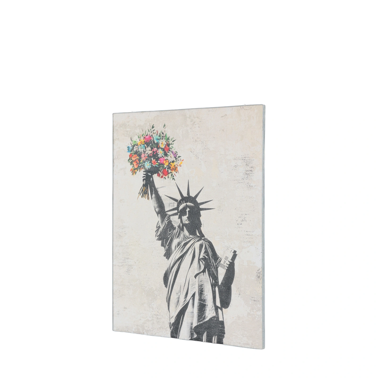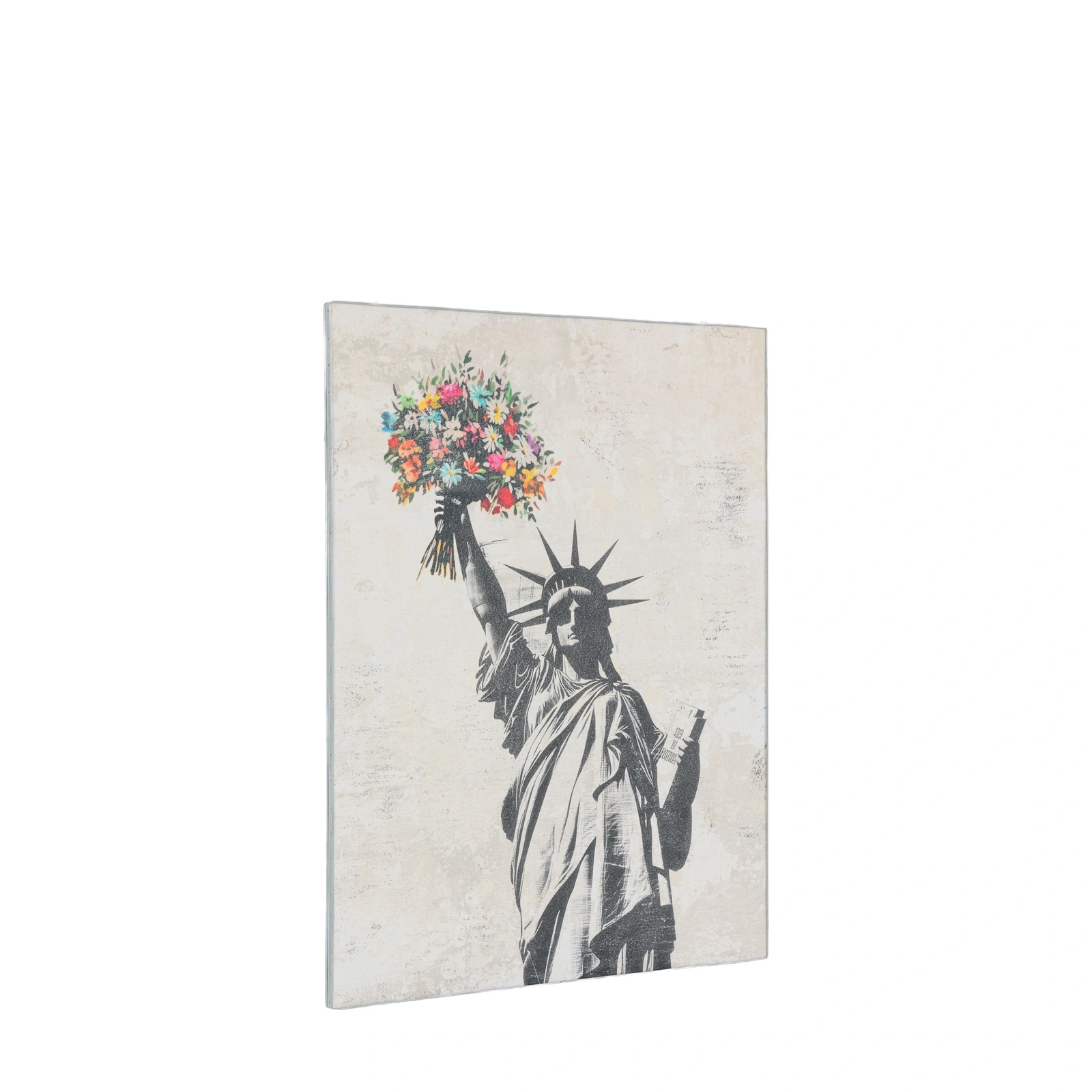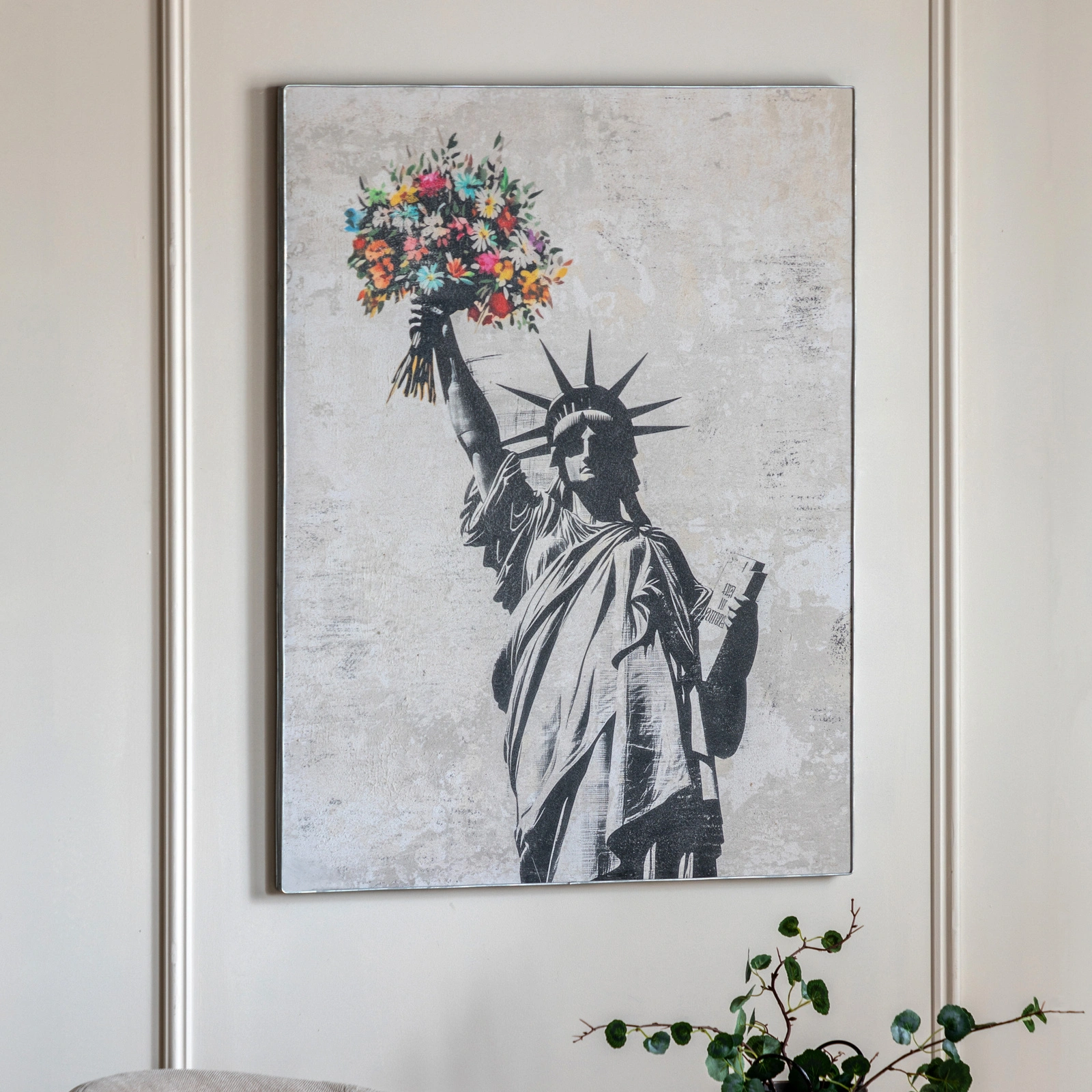 This quirky artwork reimagines an enduring symbol of freedom through colour and renewal. The monochrome Statue of Liberty bursts with vivid florals in place of flame, blending strength and grace. Encased in a rustic industrial metal frame, the artwork pairs urban grit with poetic vibrancy, a striking reflection of hope and transformation.