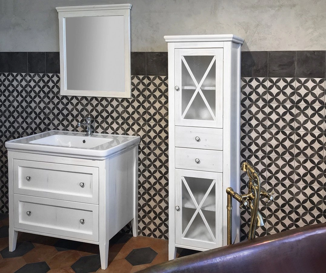 Seria CROSS to meble klasycznych kształtów z wymownym akcentem na frontach i bokach szafek, które sprawdzają się nie tylko w rustykalnych łazienkach ale wszędzie tam, gdzie prym grają naturalne materiały, twałość i precyzja wykonania. Lite drewno bukowe w odcieniu mahoniu oraz drewno świerkowe w wykończeniu starobiałym razem z przeszklonymi drzwiczkami dodaje łaizence luksusu. Szafki pod umywalkę są w kilku szerokościach, można dopełnić wysokim słupkiem dostępnym w dwu wymiarach i stylowym lustrem.