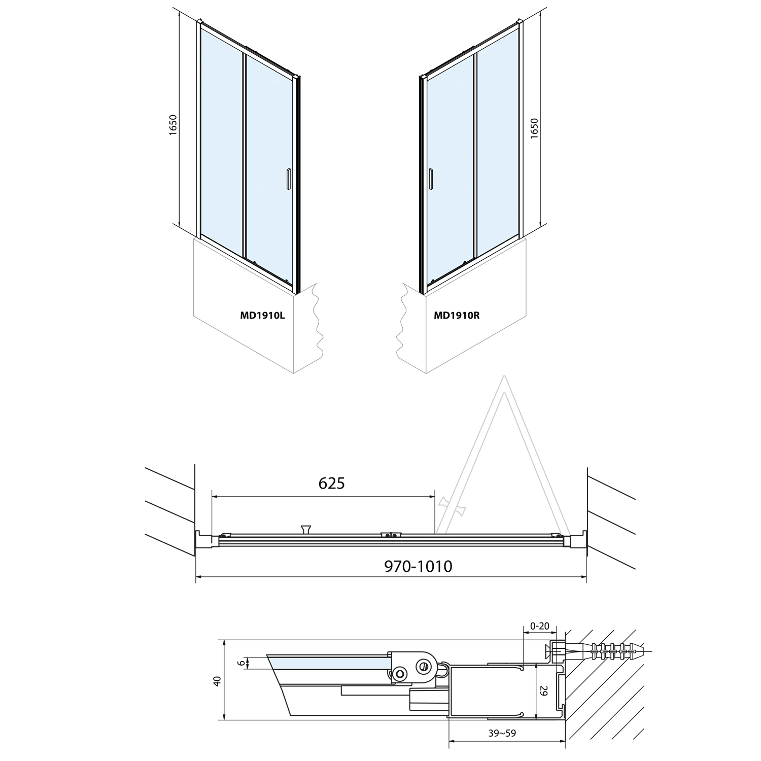 - Drzwi podzielone są na część przesuwną i część stałą - pozwalają na zmienny montaż przy otwieraniu w lewo lub w prawo