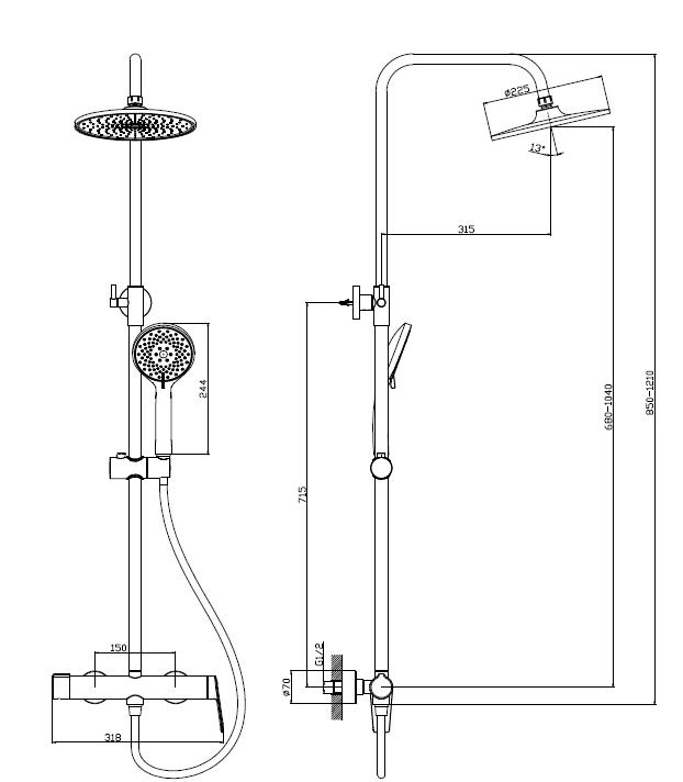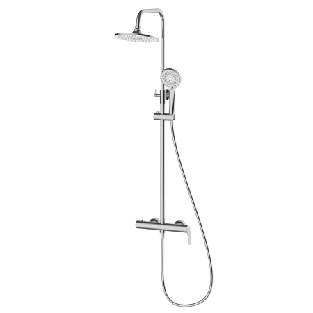 Specyfikacja kluczowa: kod: ADTR621121 • EAN: 5907333342232 • wykończenie: chrom, połysk • forma: cylindryczna, smukła • głowica deszczowni: Ø225 mm • słuchawka: 3 funkcje • długość węża: 1500 mm (PVC) • drążek: stal nierdzewna, regulacja wysokości ok. 800–1250 mm • bateria: jednouchwytowa, przełącznik mechaniczny, 2 funkcje • rozstaw przyłączy: 150 mm • klasa przepływu: A/Z • grupa akustyczna: II • korpus baterii: mosiądz.