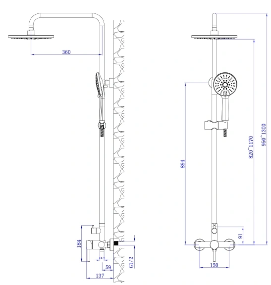 - Głowica deszczowni: Ø230 mm; regulacja drążka: ok. 866–1216 mm; wysięg ramienia: ok. 360 mm; wąż: 1500 mm; rozstaw przyłączy: 150 mm; G1/2.