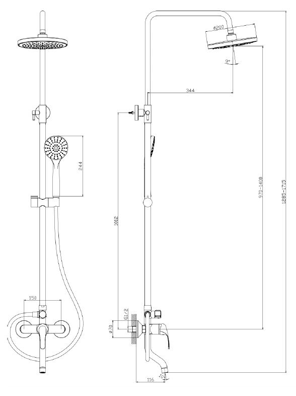 - Forma: smukła, cylindryczna; głowica natryskowa okrągła ø200 mm.
