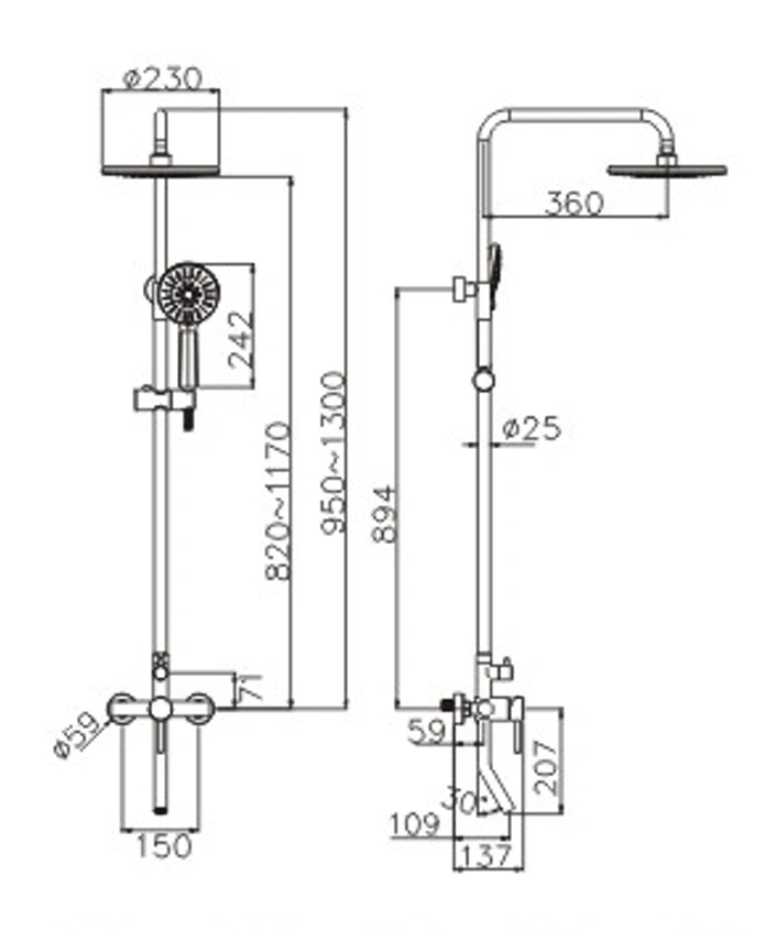- Bateria: jednouchwytowa, mieszaczowa; wylewka stała, zasięg 109 mm; drążek z regulacją wysokości 866–1216 mm; wąż PVC 1500 mm.