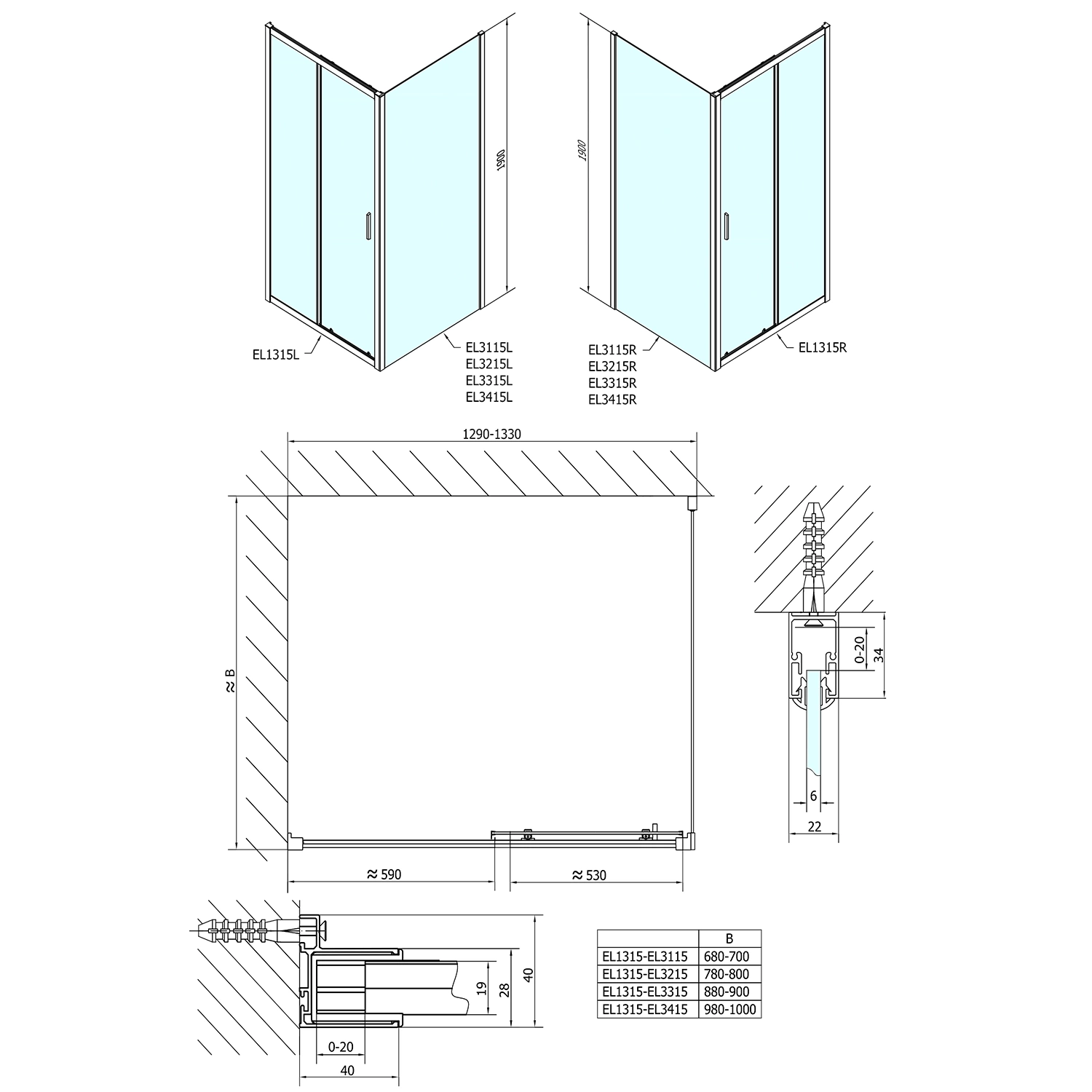 • Łatwy montaż, w przypadku drzwi przesywnych i składanych z tolerancją 20 mm poprzez regulację szyby w profilu