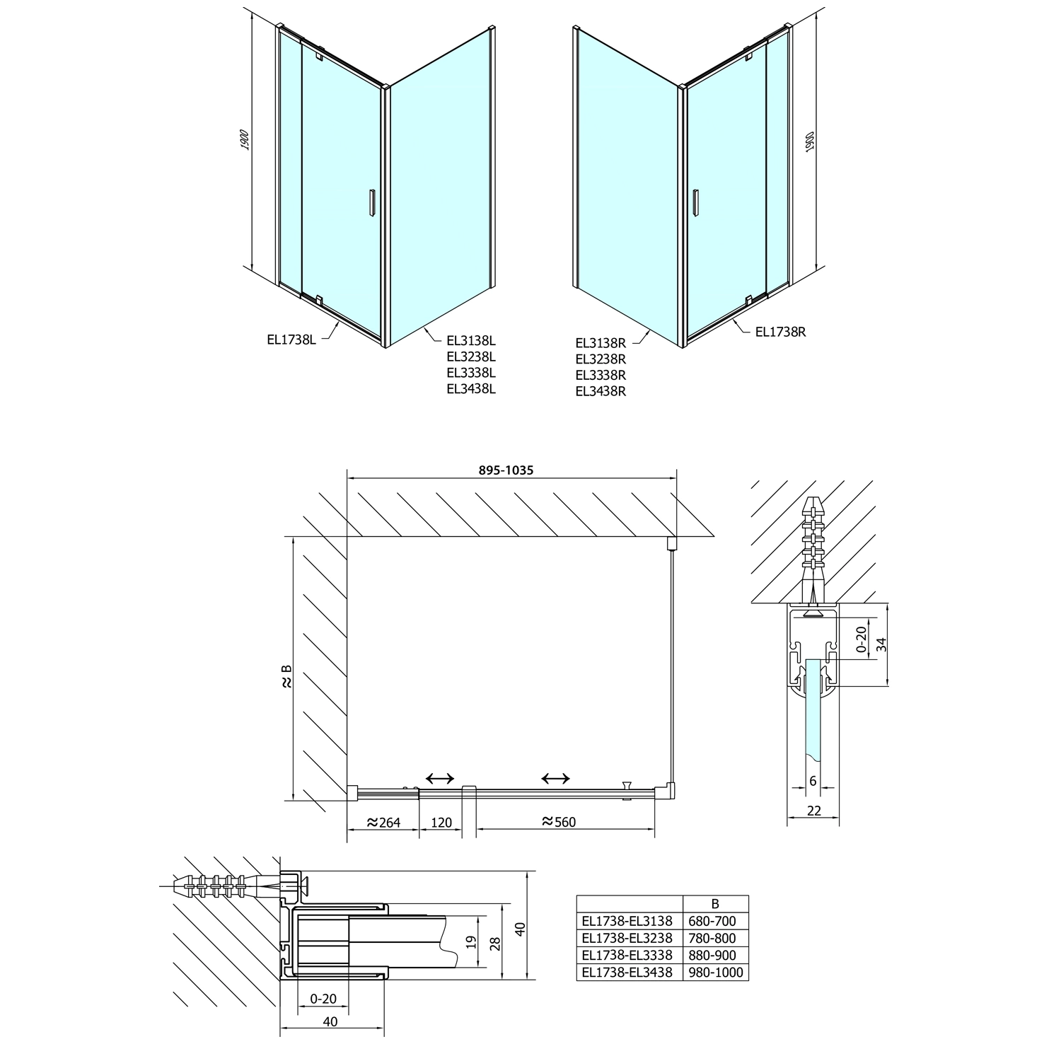 • Łatwy montaż, w przypadku drzwi przesywnych i składanych z tolerancją 20 mm poprzez regulację szyby w profilu