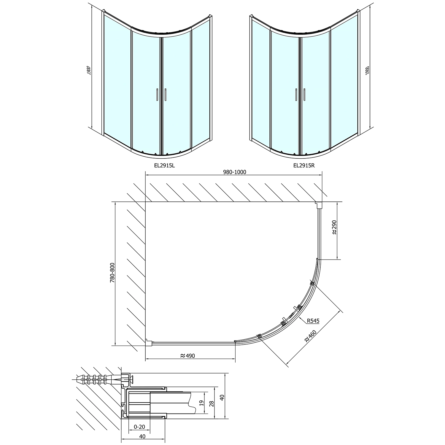 - Kabiny półokrągłe z dwuczęściowymi, przesuwnymi drzwiami, wejście narożne