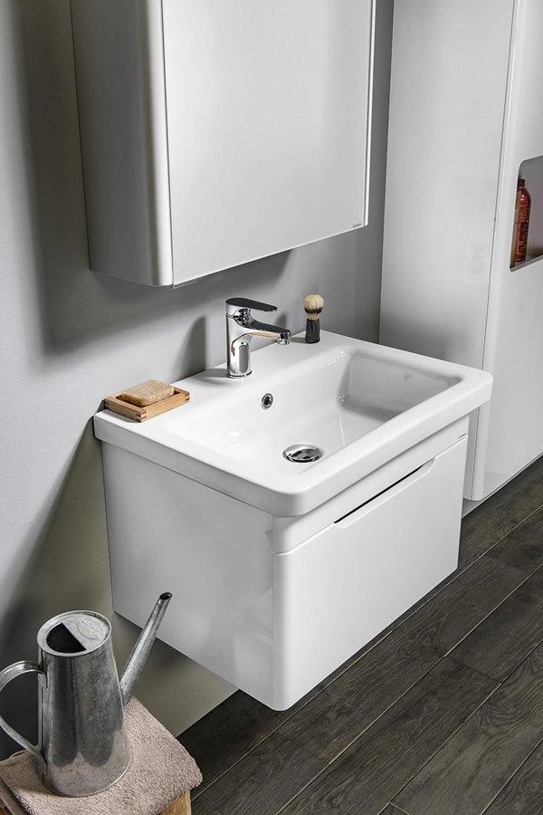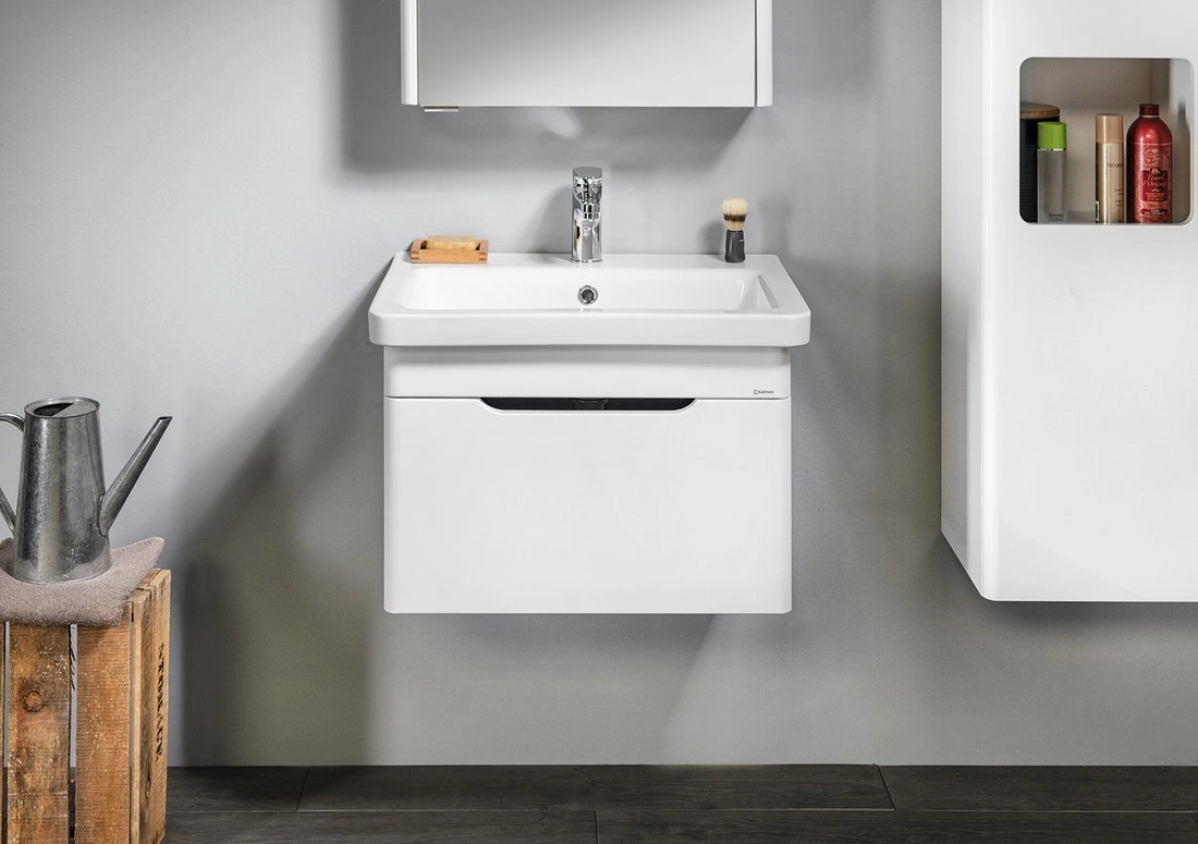 Meble ELLA doskonale współgrają z ceramicznymi umywalkami CITY. Zaokrąglone narożniki i współmierna linia otworów do wygodnego otwierania tworzą spójną całość, która idealnie pasuje do każdego projektu, w którym dominują harmonijne zaokrąglone linie. System bezuchwytowy umożliwia wygodne otwieranie szuflad, pojazdy BLUM zapewnią cichy domyk.