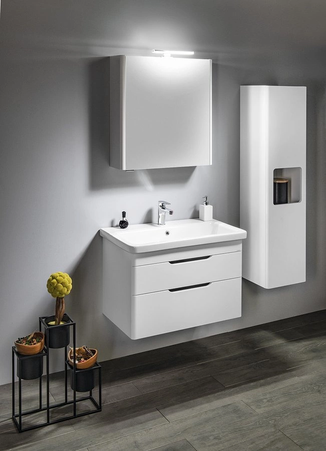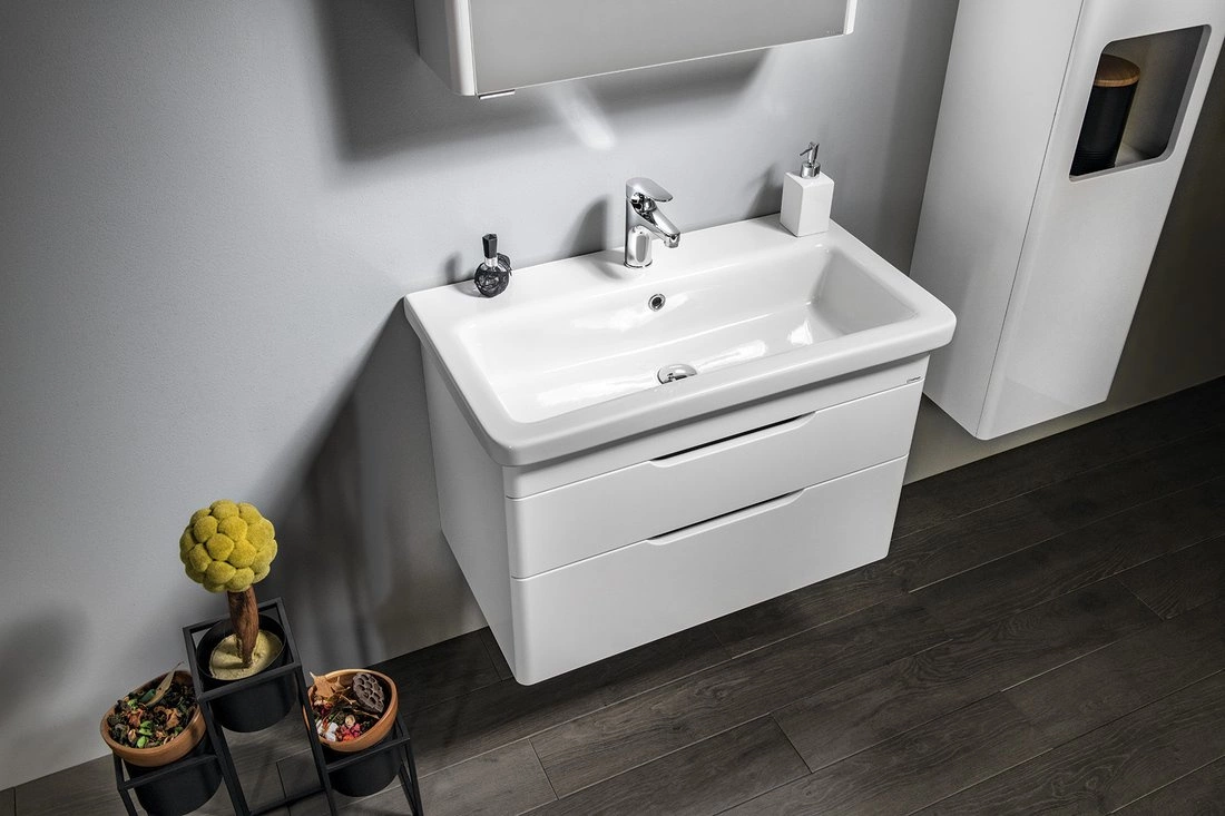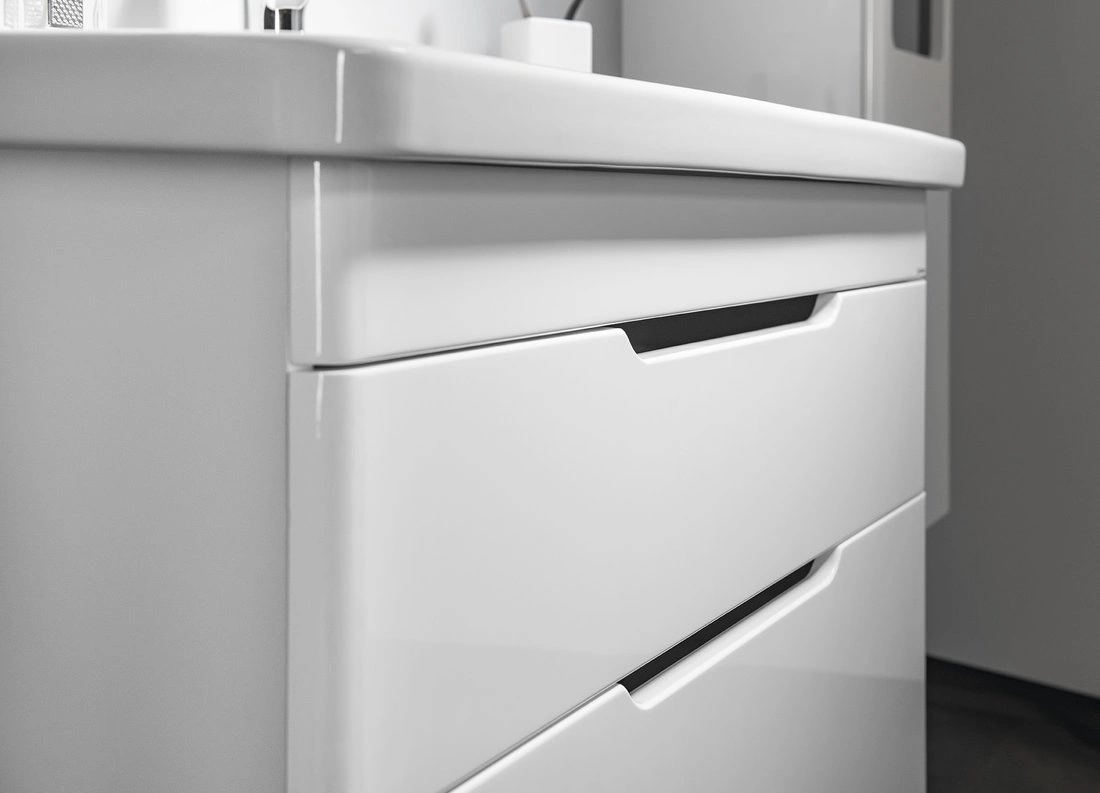 Meble ELLA doskonale współgrają z ceramicznymi umywalkami CITY. Zaokrąglone narożniki i współmierna linia otworów do wygodnego otwierania tworzą spójną całość, która idealnie pasuje do każdego projektu, w którym dominują harmonijne zaokrąglone linie. System bezuchwytowy umożliwia wygodne otwieranie szuflad, pojazdy BLUM zapewnią cichy domyk.