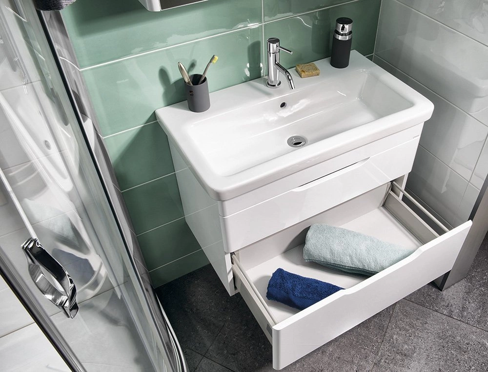 Do wyboru są szafki pod umywalkę z szufladami lub drzwiczkami i wysokie słupki w dwu wymiarach.