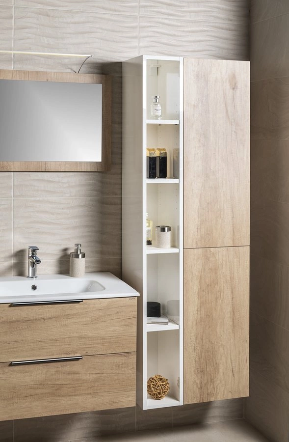 Szeroki wybór materiałów i kolorów umożliwi dopasowanie mebli łazienkowych do pozostałego wyposażenia łazienki. Niektóre szafki można opcjonalnie dopełnić wewnętrzną szufladą lub tkaninowym koszem na bieliznę, patrz Akcesoria.