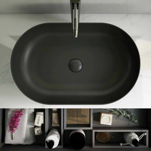 Aby uzupełnić kolekcję, wszystkie umywalki nablatowe można dopasować kolorystycznie do ceramicznego odpływu typu click-clack i umieścić na ulubionej szafce łazienkowej RAK-Joy, zintegrowanej z płytą blatu.