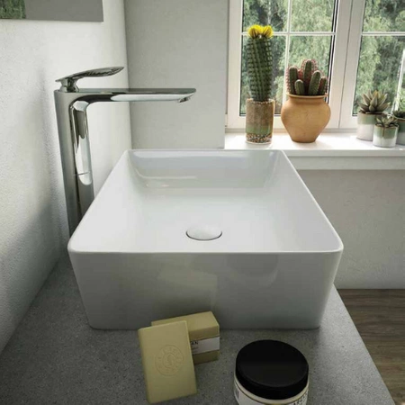 Aby uzupełnić kolekcję, wszystkie umywalki nablatowe można dopasować kolorystycznie do ceramicznego odpływu typu click-clack i umieścić na ulubionej szafce łazienkowej RAK-Joy, zintegrowanej z płytą blatu.