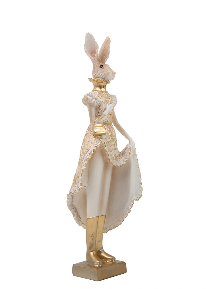 Figurka dekoracyjna SHP RABBIT beżowa / złota. Wyjątkowa dekoracja, która przyciąga uwagę swoją subtelną formą i dopracowanymi detalami. Stylizowana postać królika w ozdobnej sukni nadaje wnętrzu artystycznego i nieco bajkowego charakteru. Delikatne zdobienia oraz złote akcenty pięknie odbijają światło, podkreślając dekoracyjny, luksusowy wygląd. Wykonana z wysokiej jakości żywicy, zachwyca precyzją wykonania oraz trwałością. Doskonale sprawdzi się jako ozdoba na komodzie, konsoli lub półce, wprowadzając do wnętrza nutę elegancji. To idealny wybór dla osób ceniących oryginalne dodatki w stylu glamour i klasycznym. Wymiary: wys. 35 cm / szer. 10 cm / gł. 8 cm.