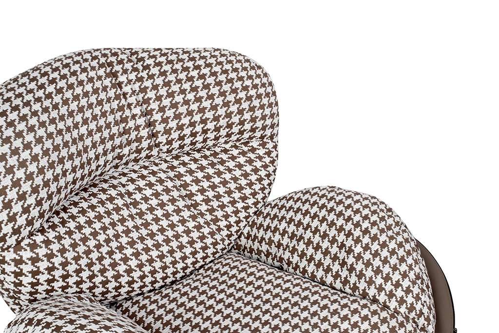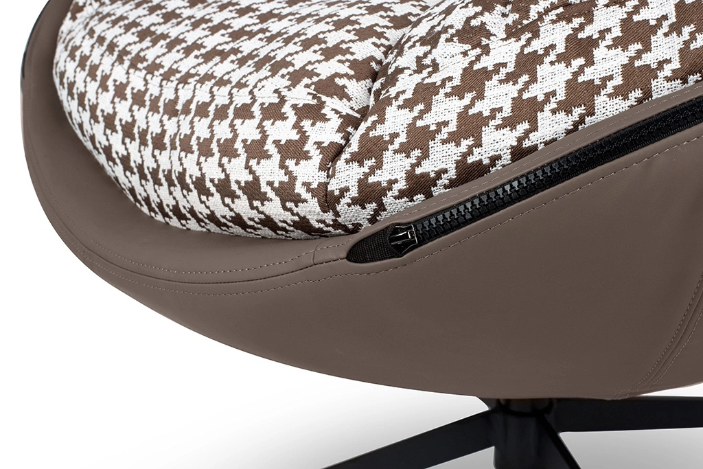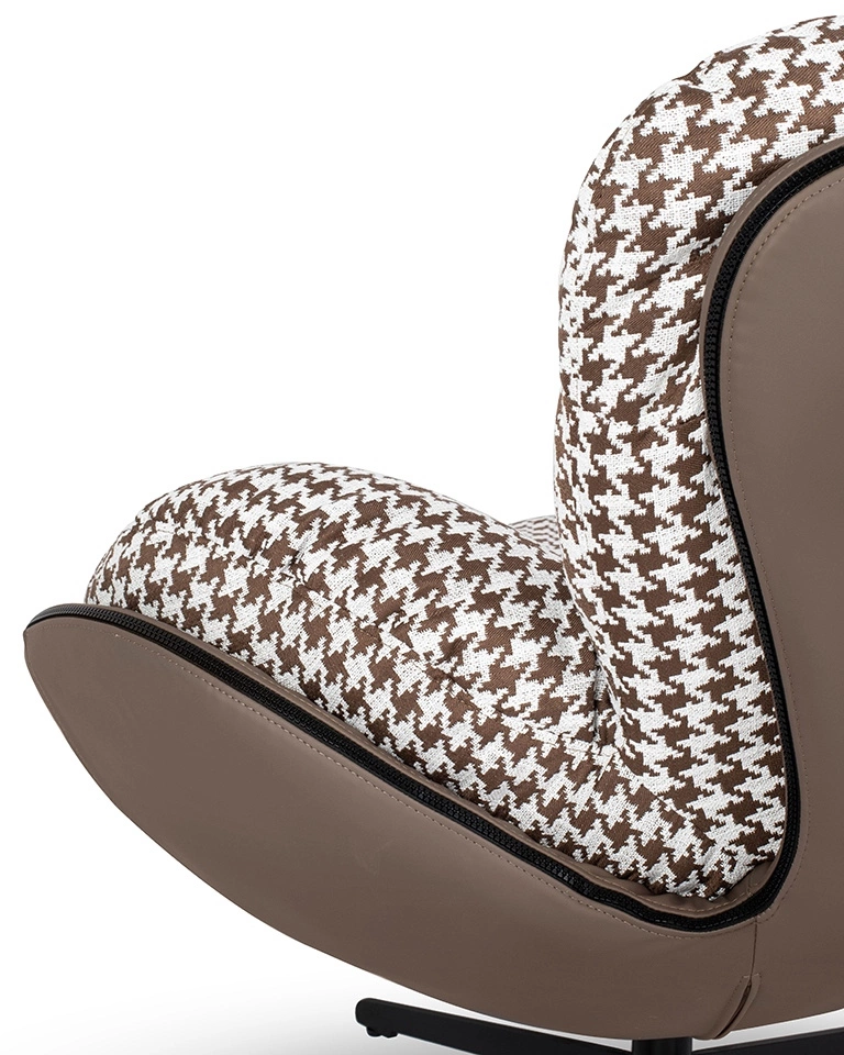Dużą, miękką poduchę obszyto tkaniną o wzorze pepitki, która symbolizuje elegancję oraz wygodę na najwyższym poziomie.