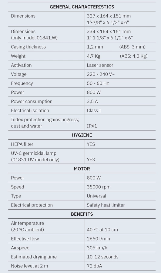 FUGA EVO elektryczna suszarka do rąk, bezdotykowa 220-240V, 800W, 164x327x151 mm, czujnik laserowy , stal nierdzewna mat