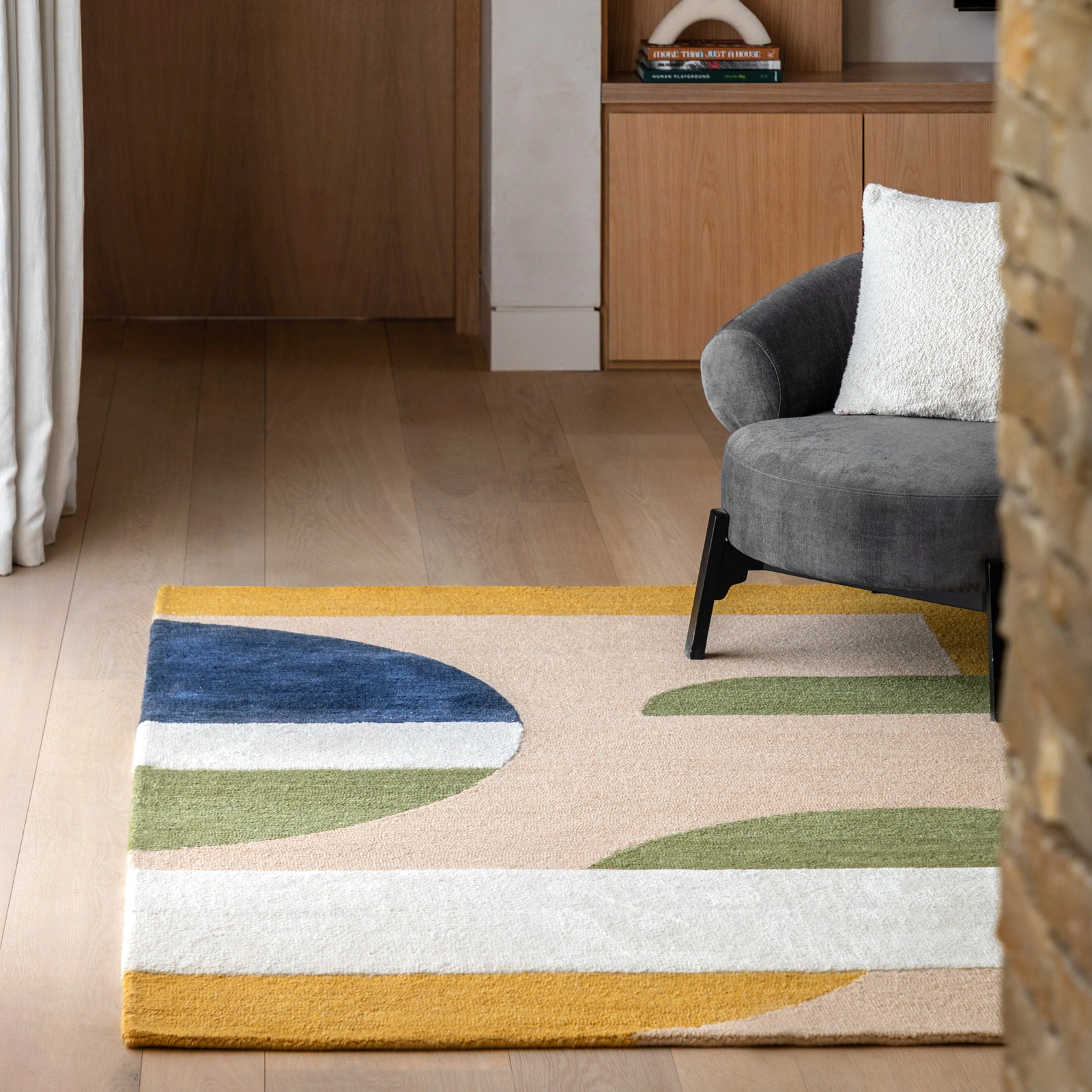 Transform your space with this mid century inspired abstract rug. The hand tufted construction enhances the bold olive, ochre, taupe and blue design while providing the most comfortable feel underfoot.