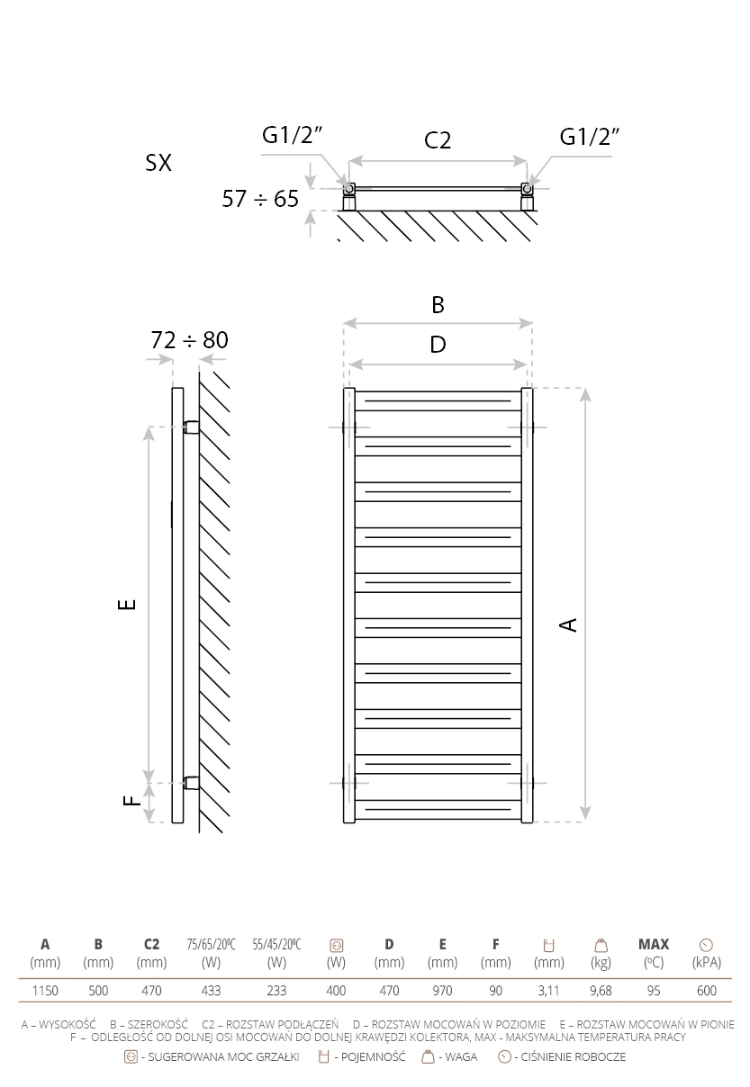 Wymiar w mm (dł x szer):1150x500:1:0, Kolor:Szary:5:0, Materiał :Stal niskowęglowa:6:0, Temperatura pracy (°C):95°C:38:0, Ciśnienie robocze (kPa):600:39:0, Pojemność (dm³):3, 11:40:1, Wydajność 75/65/20°C (W):433:41:1, Wydajność 55/45/20°C (W):233:42:1, M