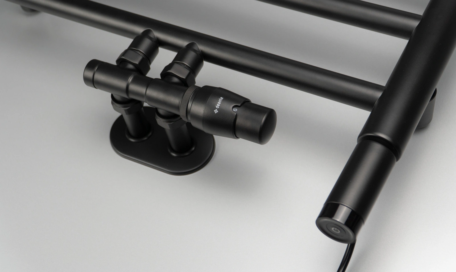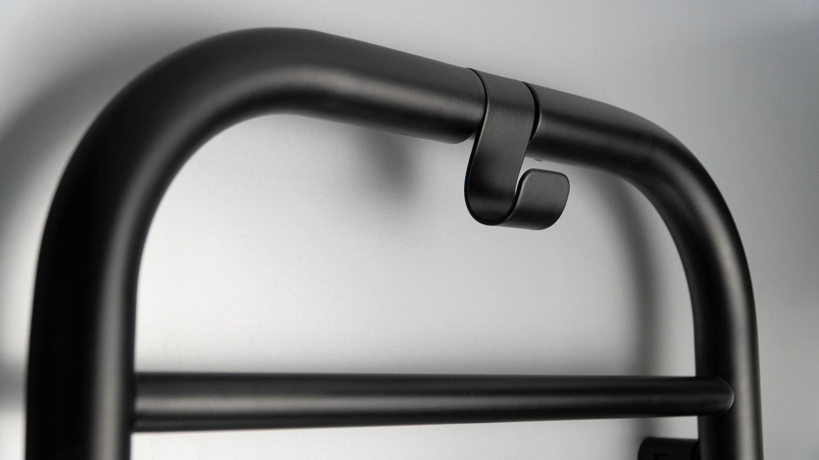 Grzejnik łazienkowy w eleganckim czarnym matowym wykończeniu, o wymiarach 850x500, charakteryzuje się obłymi liniami i wyjątkową estetyką. Wyposażony został w praktyczny haczyk na ręczniki lub szlafrok, idealny do nowoczesnych łazienek. To model hybrydowy: wodno-elektryczny, z możliwością zamontowania opcjonalnej grzałki 400W, która zapewni dodatkowe ciepło lub szybkie suszenie ręczników poza sezonem grzewczym. Do grzejnika należy dokupić zawór. Zarówno opcjonalna grzałka, jak i niezbędny zawór dostępne są w tym samym kolorze co grzejnik. Właściwości