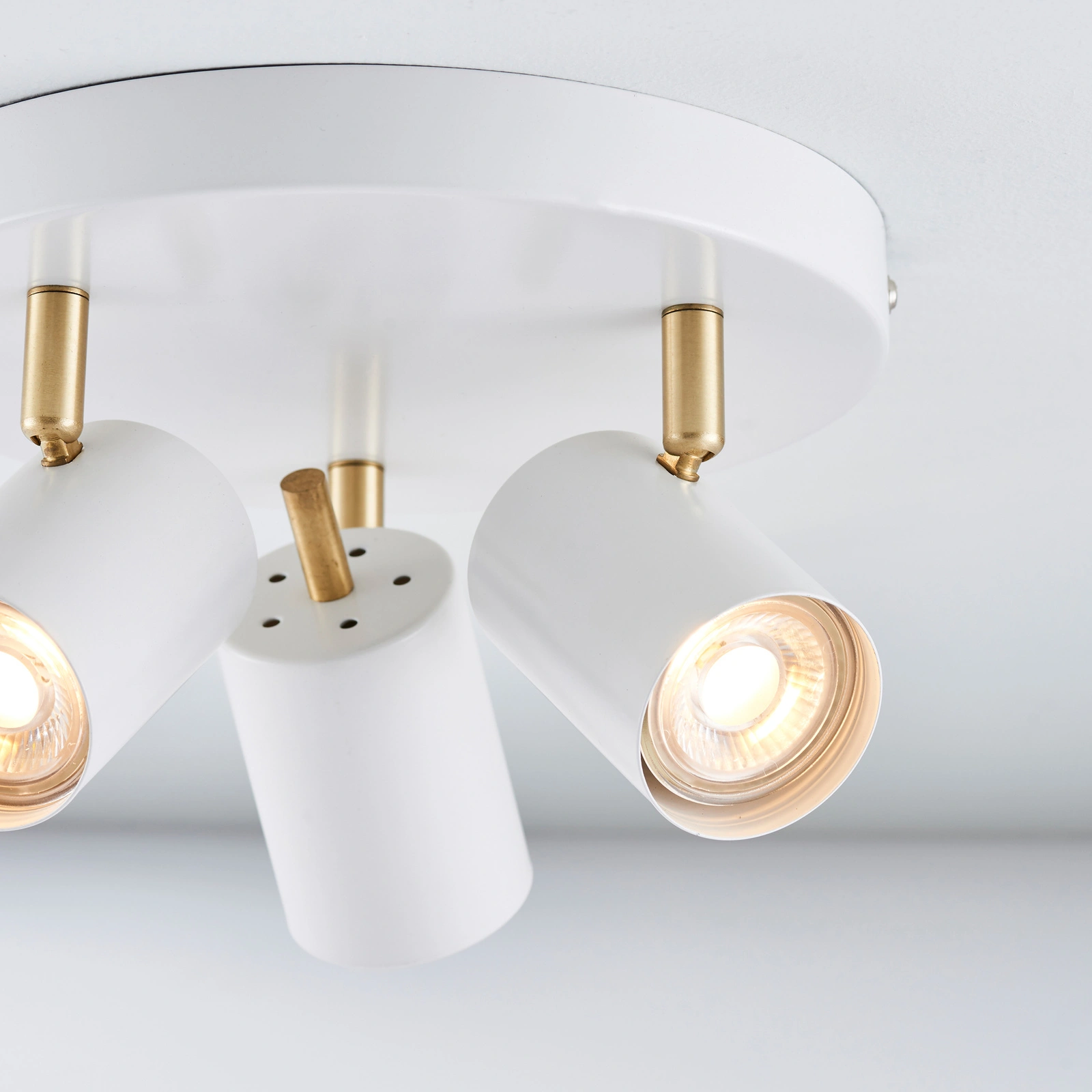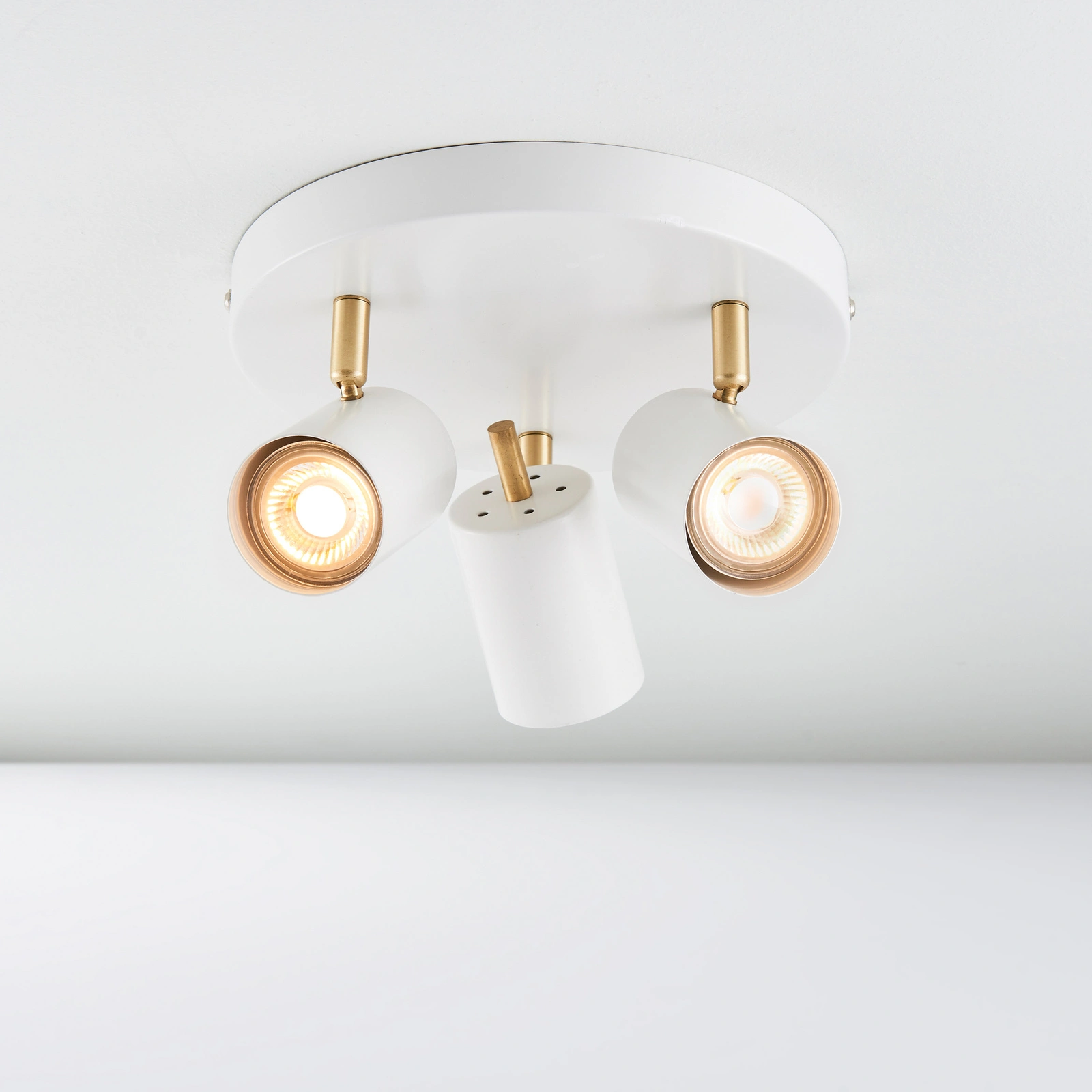 Adjustable LED spotlight supplied with 3.5W LED GU10 lamps, finished in matt white and satin gold effect trim. An energy efficient fitting which is also available in single and bar options