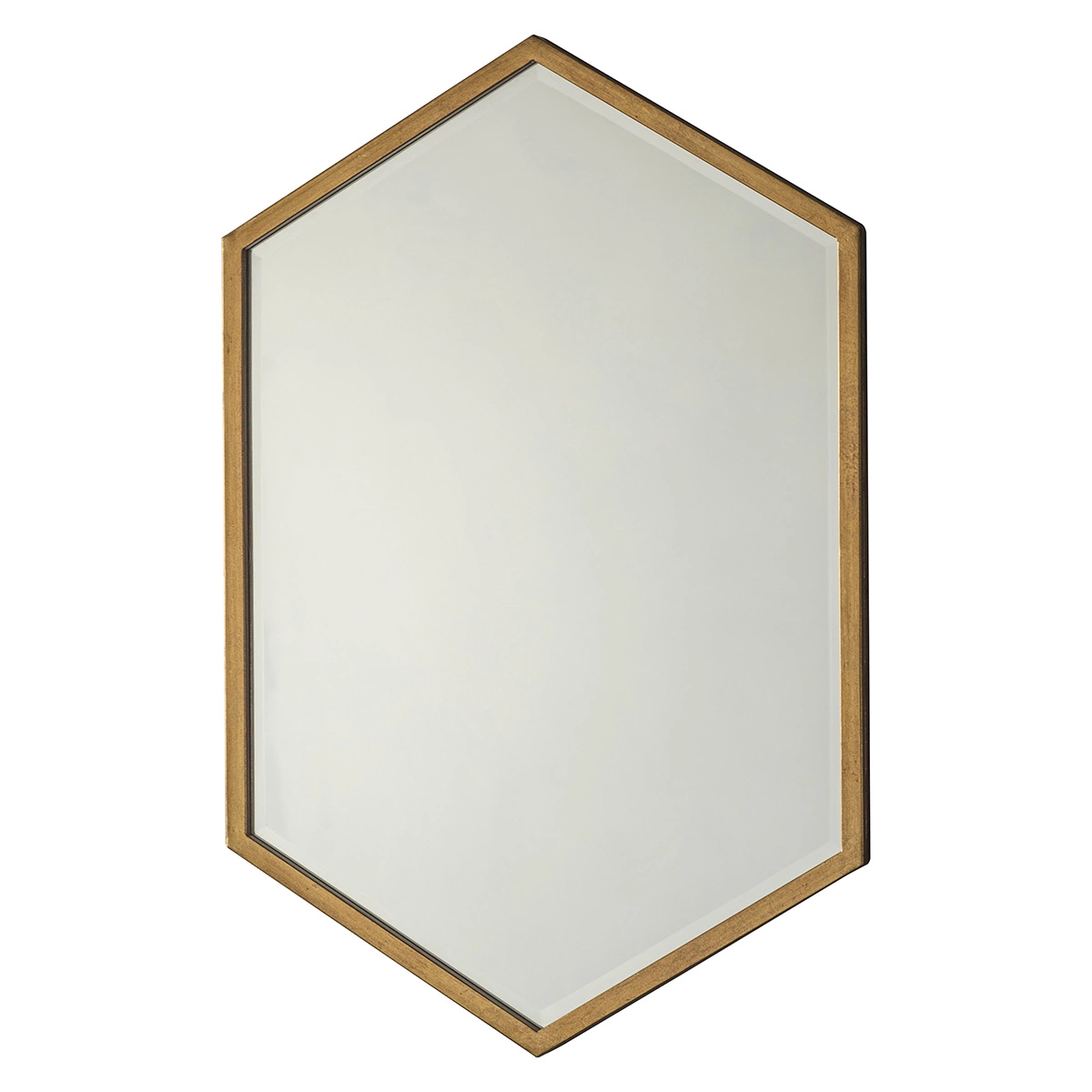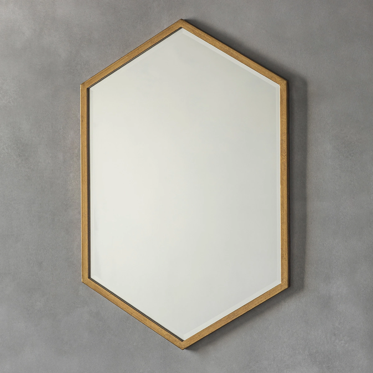 Podłużne sześciokątne lustro z fazowanymi krawędziami i prostą ramą w kolorze antycznego złota.