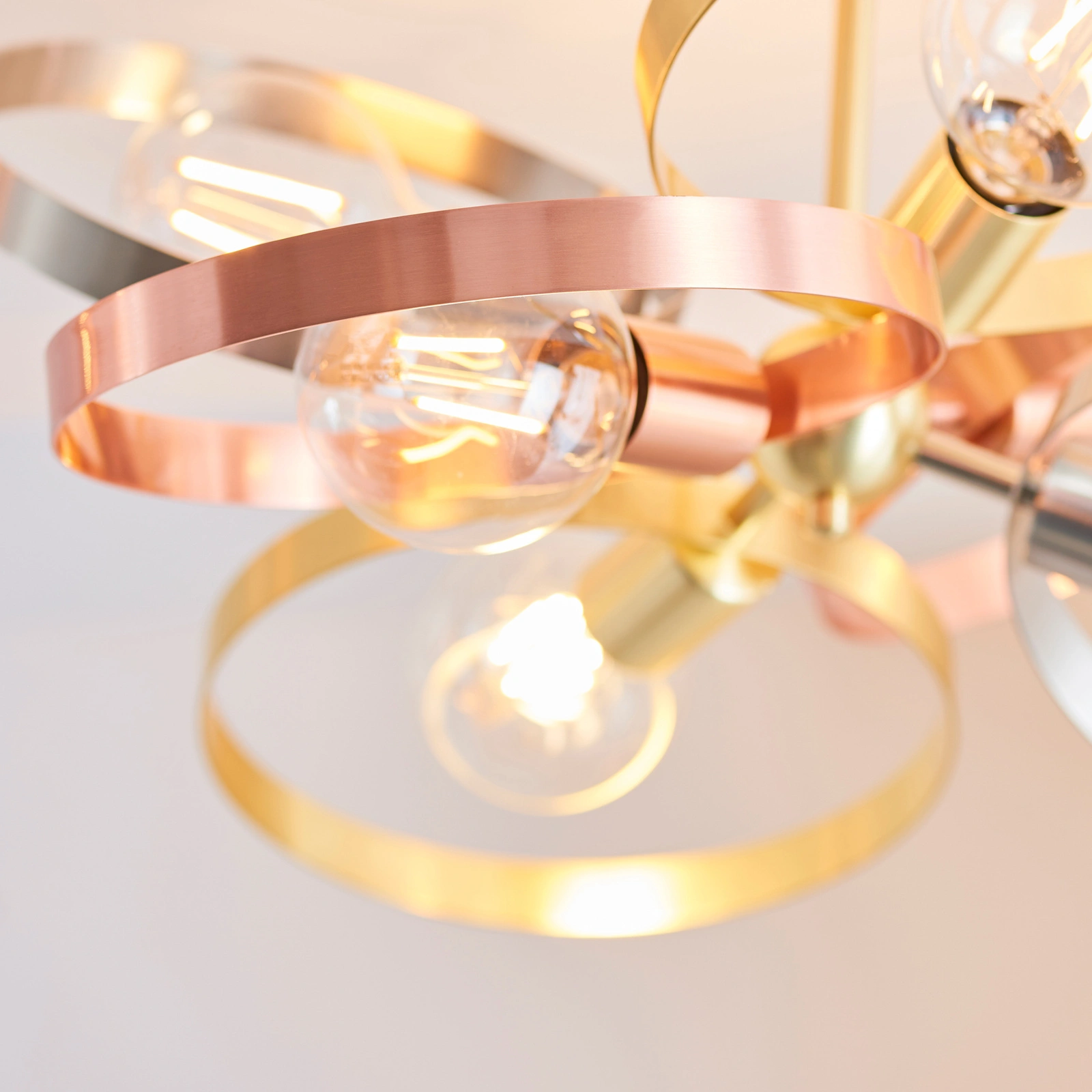 The perfect 'must have' ceiling light. The mixed plated finishes and open hoop design make this bang on-trend with a fun contemporary aesthetic, easily placeable in today's modern homes. Pair with LED filament lamps to complete the look.