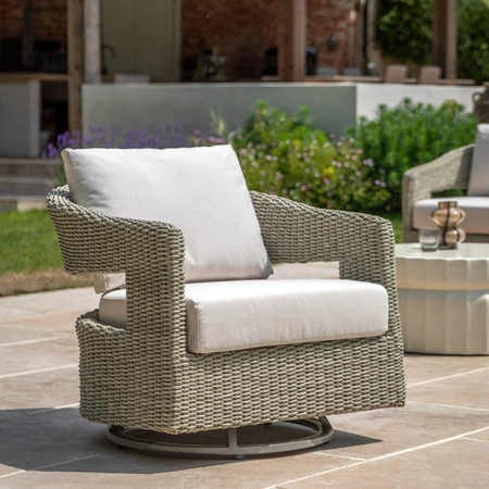 This stylish swivel chair is designed for both comfort and style. Crafted with a blend of natural wicker and plush cushions, it offers a relaxing and supportive seating experience. The swivel function allows you to easily adjust your position to enjoy the best view of your surroundings. The neutral color palette complements any outdoor decor, making it a perfect addition to any patio or garden.