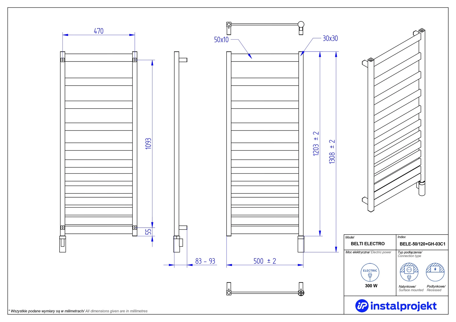 - Instal Projekt Belti Electro Grzejnik elektryczny 50x120 cm czarny mat/black mat BELE-50/120C31+GH-03C2