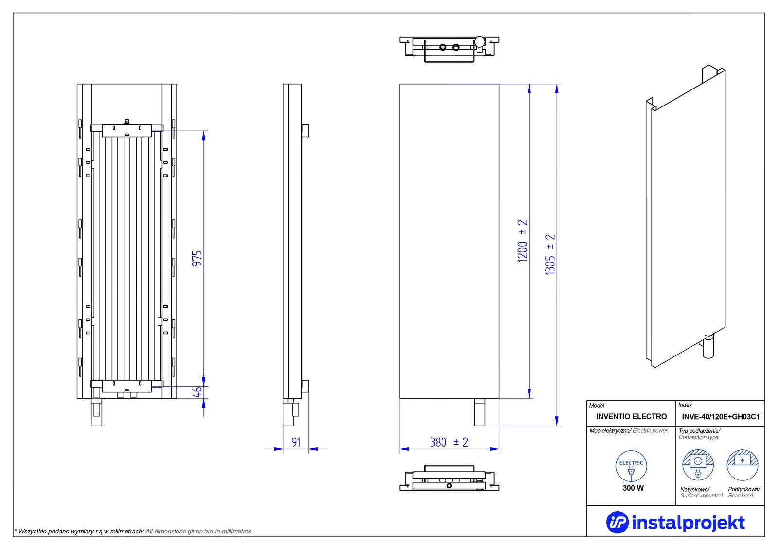 Instal Projekt Inventio Electro Grzejnik elektryczny 40x120 cm biały/silk ekran szary c70 INVE-40/120E70+GH-03C3