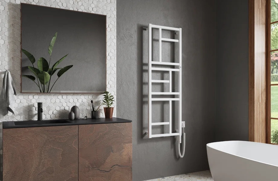Geometryczny grzejnik elektryczny MONDRIAN ELECTRO intryguje i z sukcesem ożywia nawet najprostszą aranżację. Produkt jest nowoczesnym pomysłem na zapewnienie ciepła, suszenie tekstyliów i dekorację wnętrza. Sprawdza się zarówno obok regału z książkami, obrazu, jak i łazienkowej umywalki. Do każdego z tych miejsc wprowadza elegancję i nieprzemijający styl. Dzięki innowacyjnej grzałce elektrycznej działa zawsze, gdy tego potrzebujesz – niezależnie od sezonu grzewczego. Za sprawą dedykowanych relingów i wieszaków staje się jeszcze bardziej użyteczny, nie tracąc ani trochę na designie.