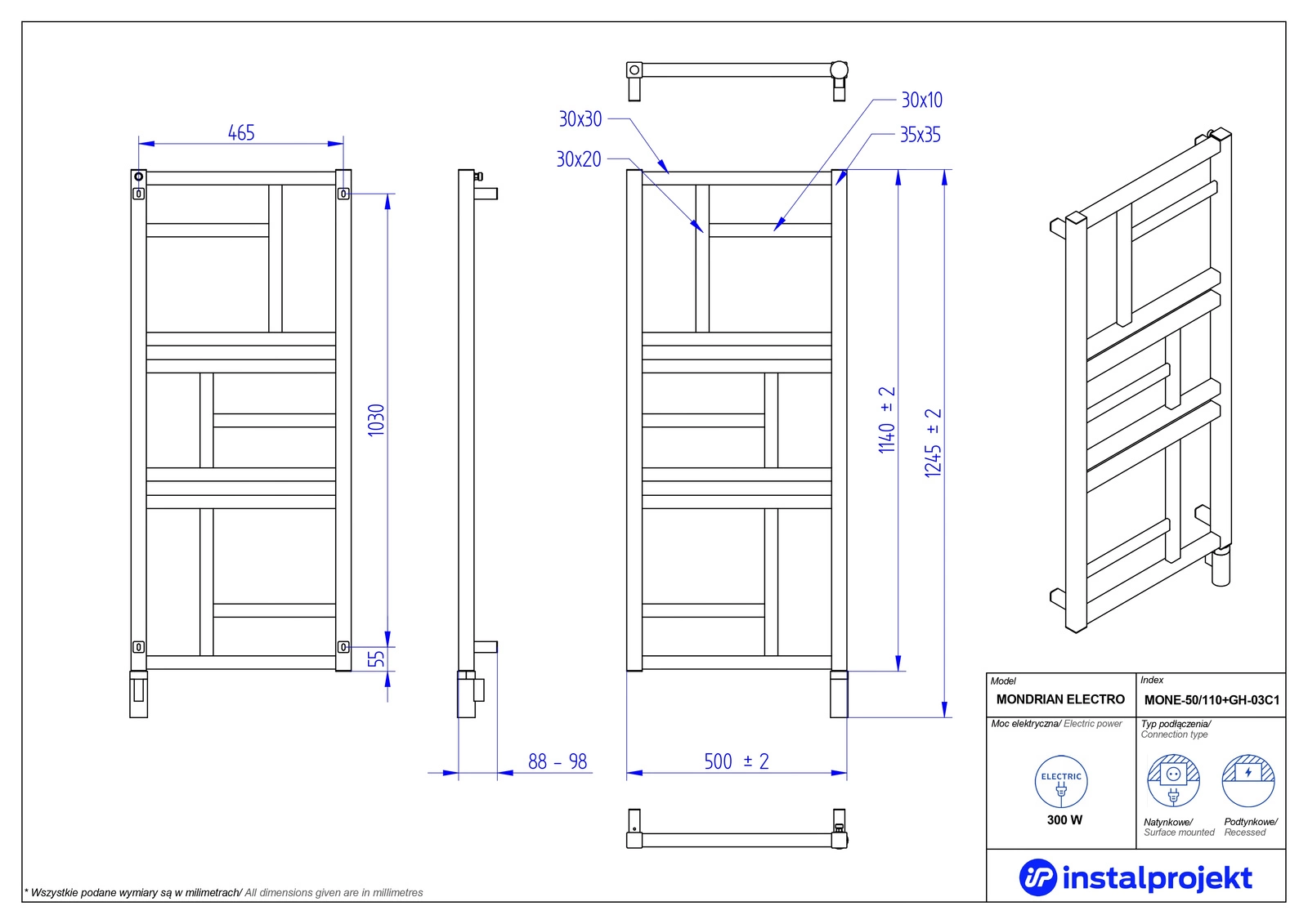 - Instal Projekt Mondrian Electro Grzejnik elektryczny 50x110 cm czarny mat/black mat MONE-50/110C31+GH-03C2