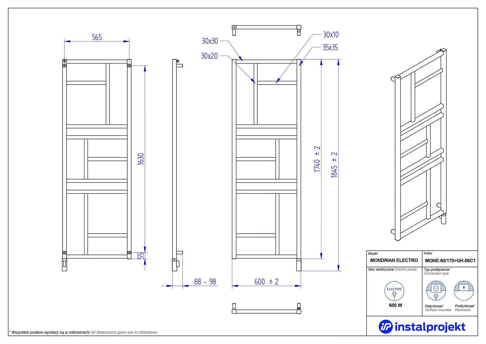 • Instal Projekt Mondrian Electro Grzejnik elektryczny 60x170 cm biały mat/white mat MONE-60/170C34+GH-06C1