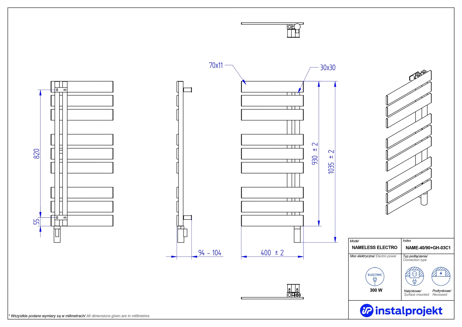 - Instal Projekt Nameless Electro Grzejnik elektryczny 40x90 cm biały połysk/white silk NAME-40/90+GH-03C1